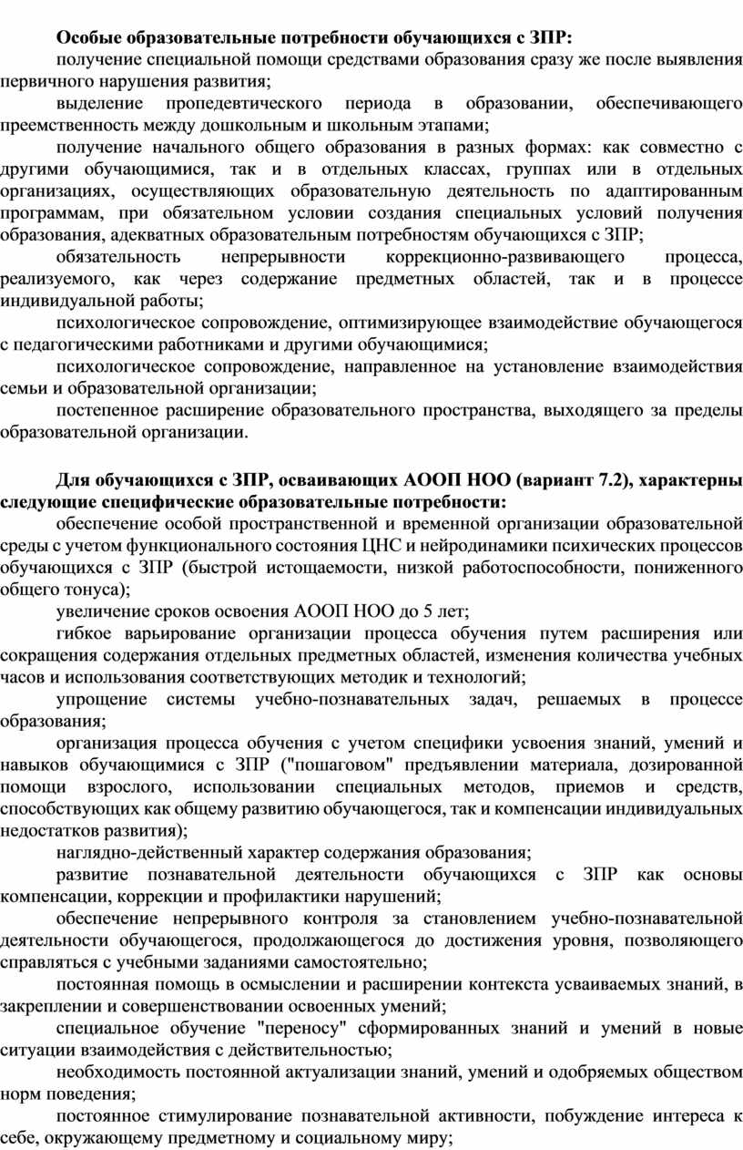 Особые образовательные потребности обучающихся с ЗПР, осваивающих АООП НОО (вариант 7.2). |