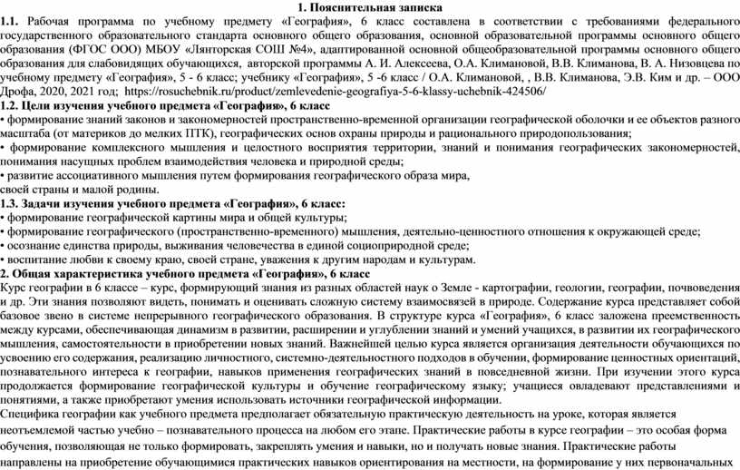 1.1. Рабочая программа по учебному предмету «География», 6 класс составлена в соответствии с требованиями федерального государственного образовательного стандарта основного общего образования, основной образовательной программы основного общего образования (ФГОС ООО) МБОУ «Лянторская СОШ №4», адаптированной основной общеобразовательной программы основного общего образования для слабовидящих обучающихся, авторской программы А. И. Алексеева, О.А. Климановой, В.В. Климанова, В. А. Низовцева по учебному предмету «География», 5 - 6 класс; учебнику «География», 5 -6 класс / О.А. Климановой, , В.В. Климанова, Э.В. Ким и др. – ООО Дрофа, 2020, 2021 год; https://rosuchebnik.ru/product/zemlevedenie-geografiya-5-6-klassy-uchebnik-424506/
