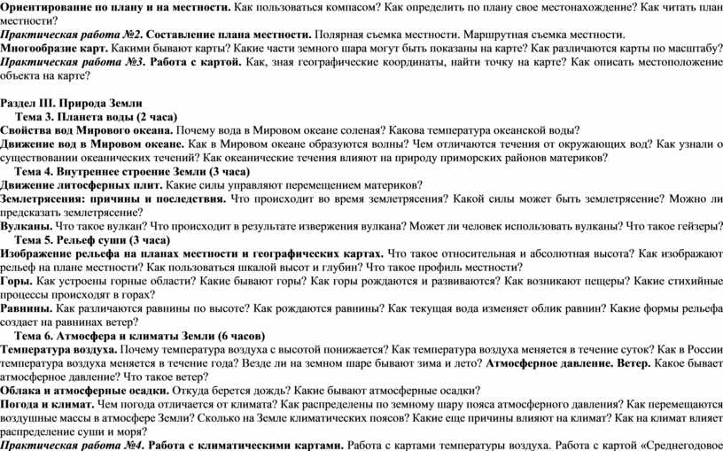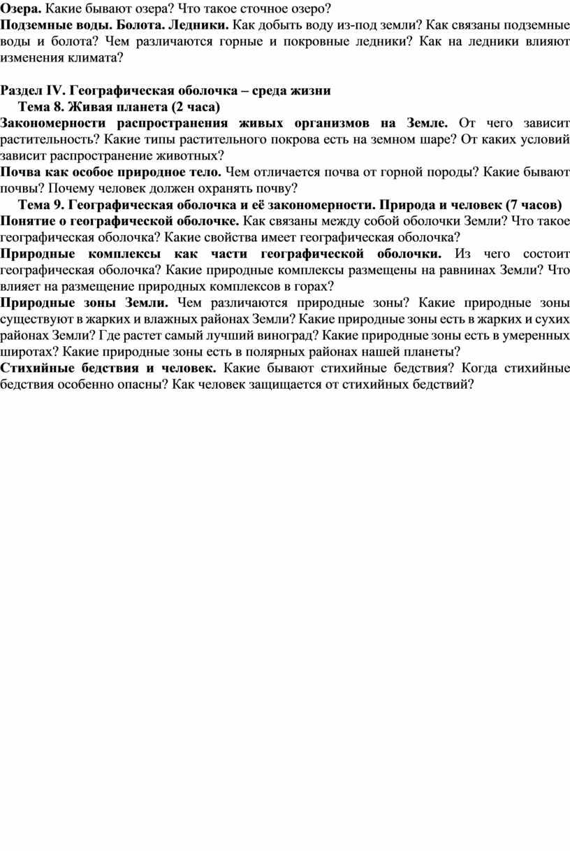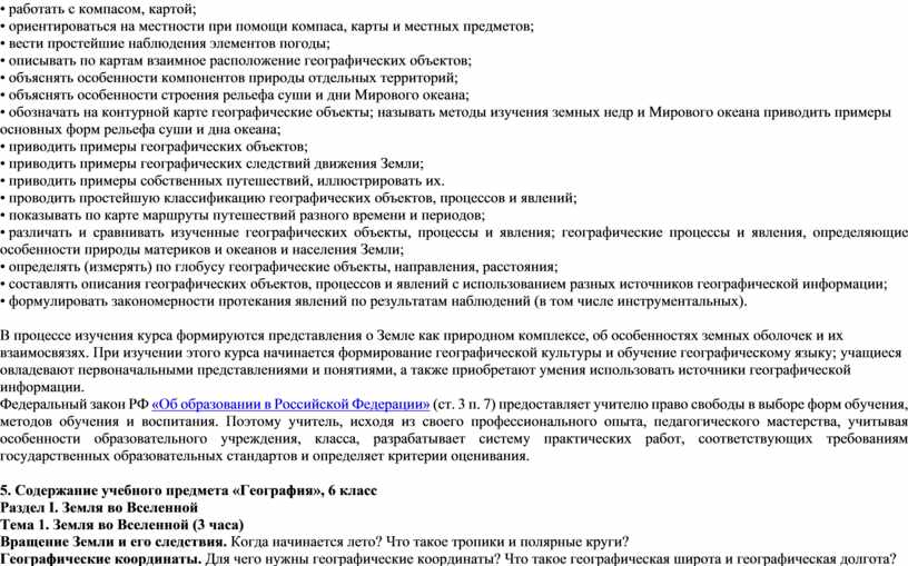 Изложенный в программе материал соответствует разделам стандарта основного общего образования по географии состоит из четырех разделов: «Земля во Вселенной», «Путешествия и их географическое отражение», «Природа Земли», «Географическая оболочка – среда жизни».