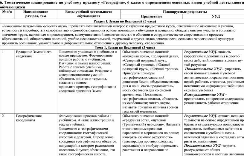 Тематическое планирование учебного предмета «География», 6 класс с определением основных видов учебной деятельности обучающихся……… |