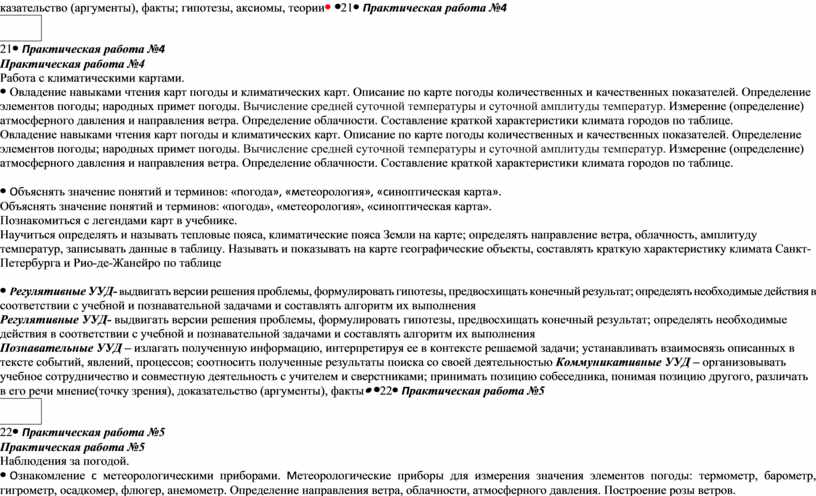 Специфика географии как учебного предмета предполагает обязательную практическую деятельность на уроке, которая является неотъемлемой частью учебно – познавательного процесса на любом его этапе. Практические работы в курсе географии – это особая форма обучения, позволяющая не только формировать, закреплять умения и навыки, но и получать новые знания. Практические работы направлены на приобретение обучающимися практических навыков ориентирования на местности, на формирование у них первоначальных навыков работы с картой как основным источником географической информации, а также рисунками, схемами, таблицами. При работе с картами основное внимание уделяется знакомству с ее содержанием, выявлению основных картографируемых явлений и объектов. Программой предусматривается выполнение в данном курсе пяти обязательных практических работ. По мере овладения учащимися умениями самостоятельной работы с различными источниками информации особое место отводится проектной деятельности. Предлагаются картографические проектные задания общегеографического, страноведческого содержания. Изучение данного курса определяет его особую роль: помимо раскрытия основных знаний, формирования географических умений и навыков, он влияет на мировоззрение обучающихся, имеет огромное воспитательное значение.