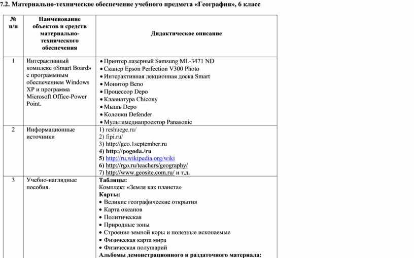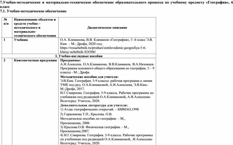 Учебно-методическое и материально-техническое обеспечение образовательного процесса по учебному предмету «География», 6 класс……… |