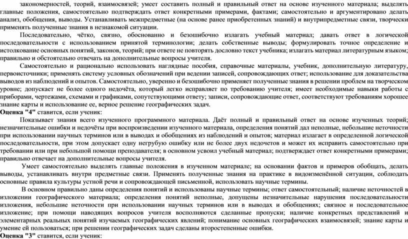 В основном правильно даны определения понятий и использованы научные термины; ответ самостоятельный; наличие неточностей в изложении географического материала; определения понятий неполные, допущены незначительные нарушения последовательности изложения, небольшие неточности при использовании научных терминов или в выводах и обобщениях; связное и последовательное изложение; при помощи наводящих вопросов учителя восполняются сделанные пропуски; наличие конкретных представлений и элементарных реальных понятий изучаемых географических явлений; понимание основных географических взаимосвязей; знание карты и умение ей пользоваться; при решении географических задач сделаны второстепенные ошибки.
