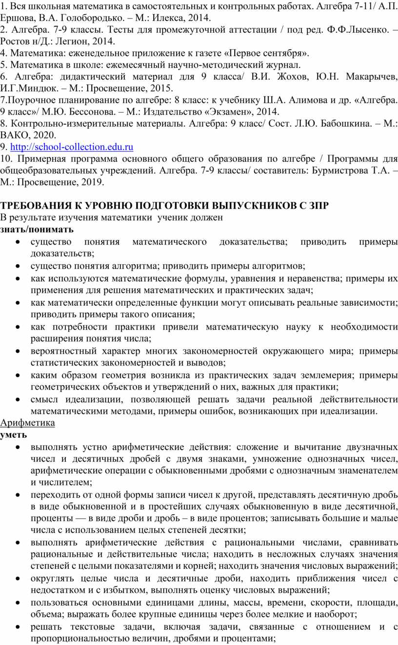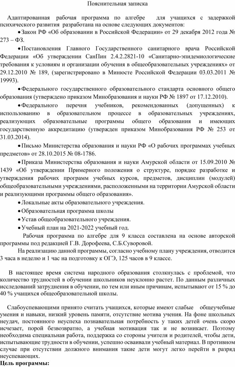 Адаптированная рабочая программа по алгебре для учащихся с задержкой психического развития разработана на основе следующих документов: