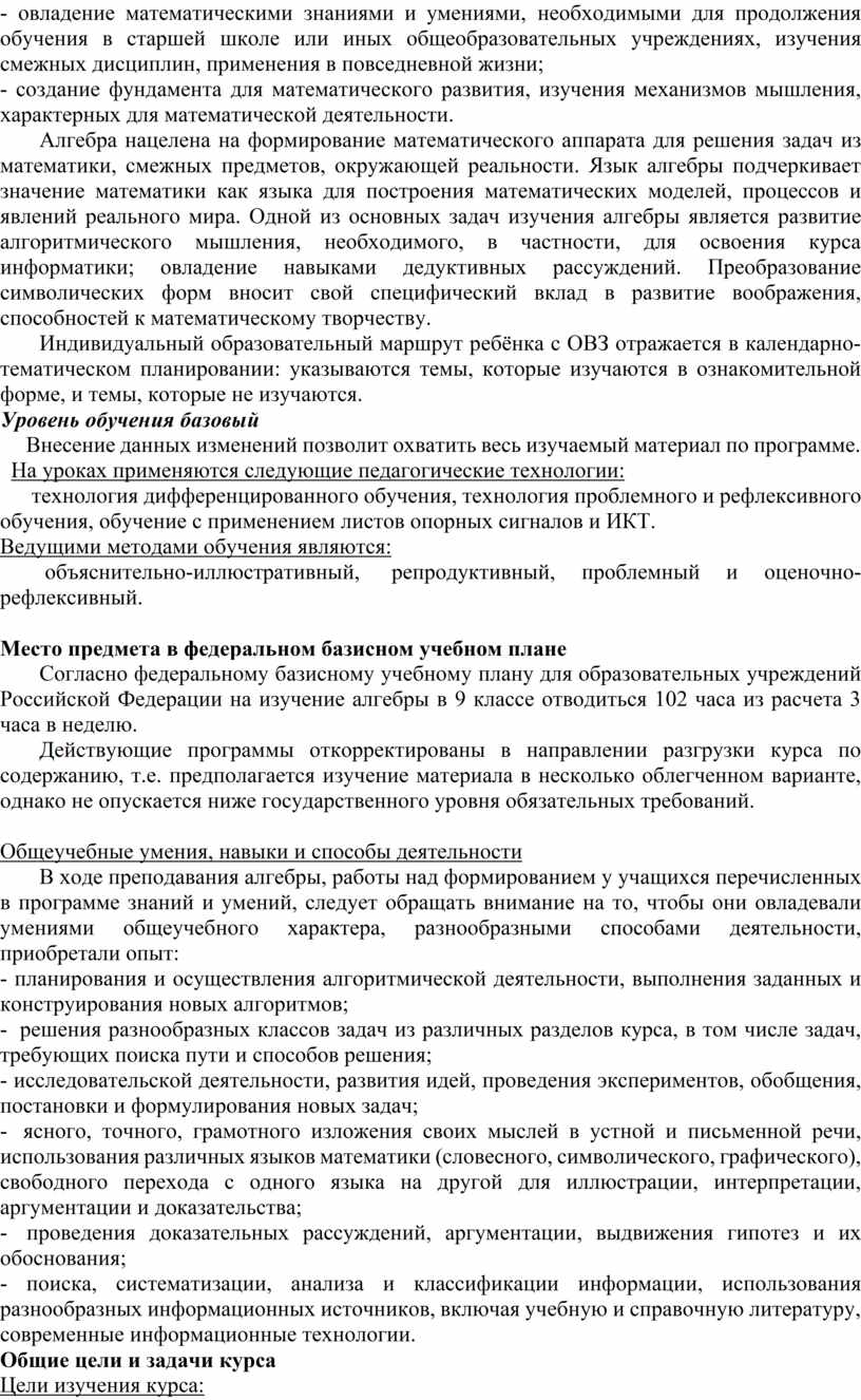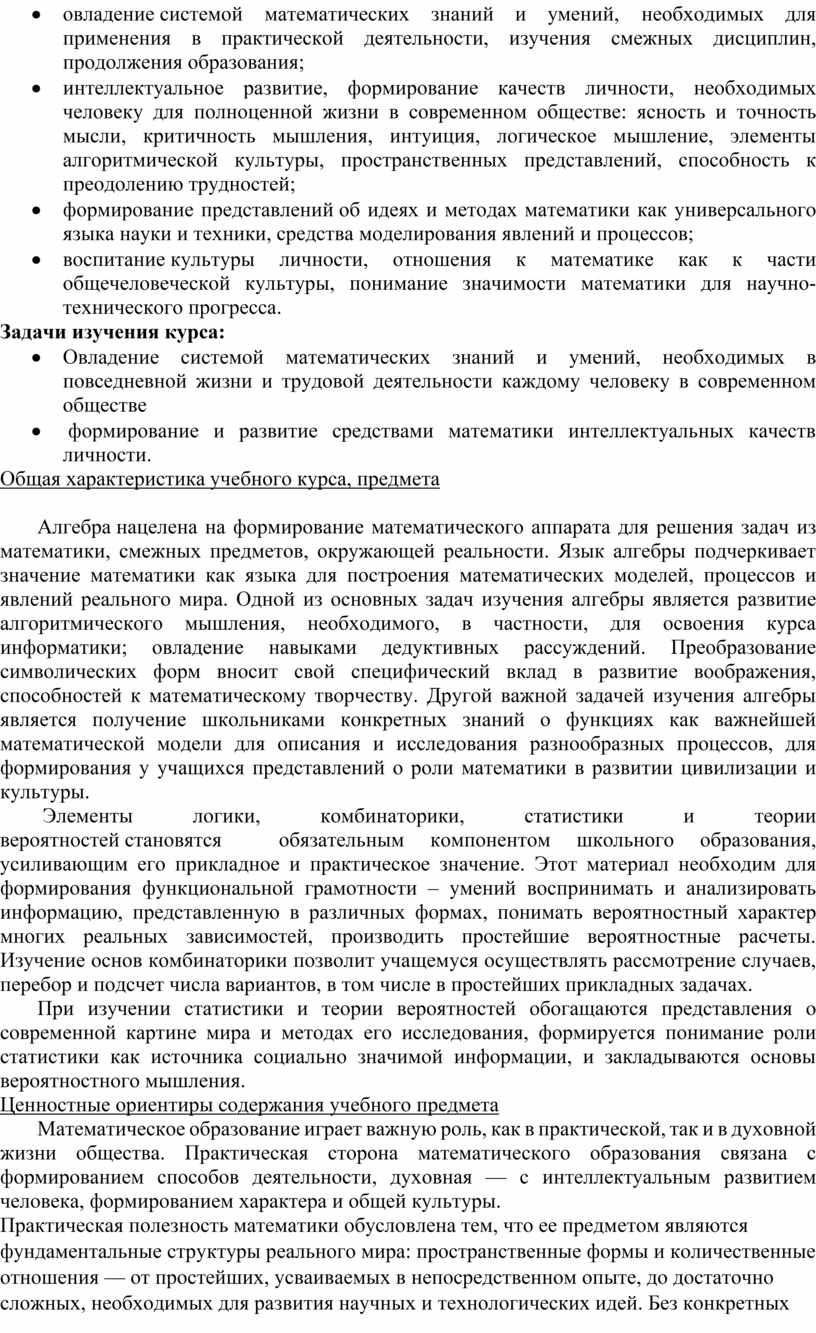 Алгебра нацелена на формирование математического аппарата для решения задач из математики, смежных предметов, окружающей реальности. Язык алгебры подчеркивает значение математики как языка для построения математических моделей, процессов и явлений реального мира. Одной из основных задач изучения алгебры является развитие алгоритмического мышления, необходимого, в частности, для освоения курса информатики; овладение навыками дедуктивных рассуждений. Преобразование символических форм вносит свой специфический вклад в развитие воображения, способностей к математическому творчеству. Другой важной задачей изучения алгебры является получение школьниками конкретных знаний о функциях как важнейшей математической модели для описания и исследования разнообразных процессов, для формирования у учащихся представлений о роли математики в развитии цивилизации и культуры.