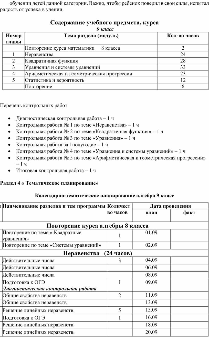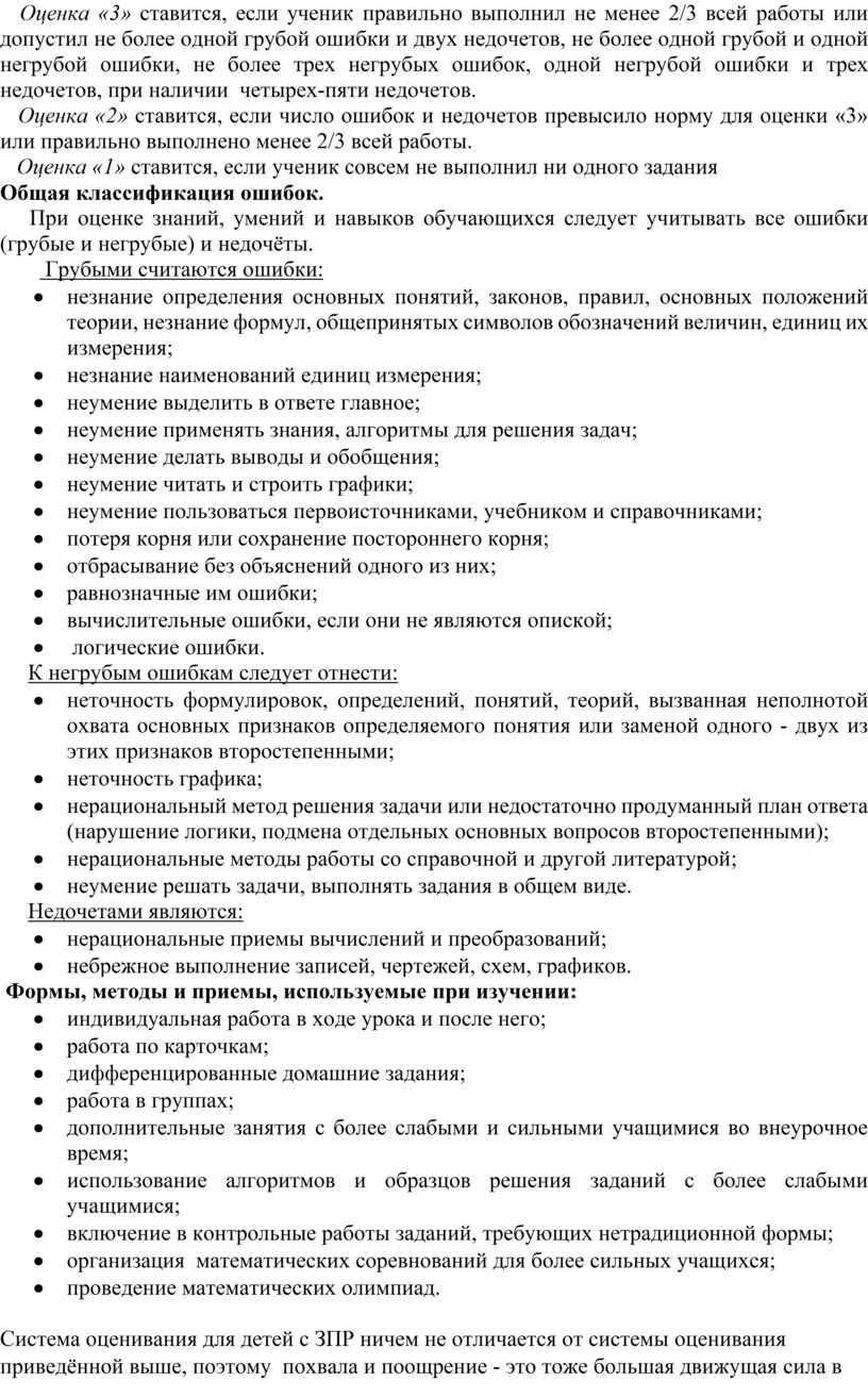 Обучающиеся с ОВЗ из-за особенностей своего психического развития трудно усваивают программу по математике в старших классах. В связи с этим в программу общеобразовательной школы - внесены некоторые изменения: усилены разделы, связанные с повторением пройденного материала, увеличено количество упражнений и заданий, связанных с практической деятельностью обучающихся; некоторые темы даны как ознакомительные; исключены отдельные трудные доказательства; теоретический материал рекомендуется преподносить в процессе решения задач и выполнения заданий наглядно- практического характера.
