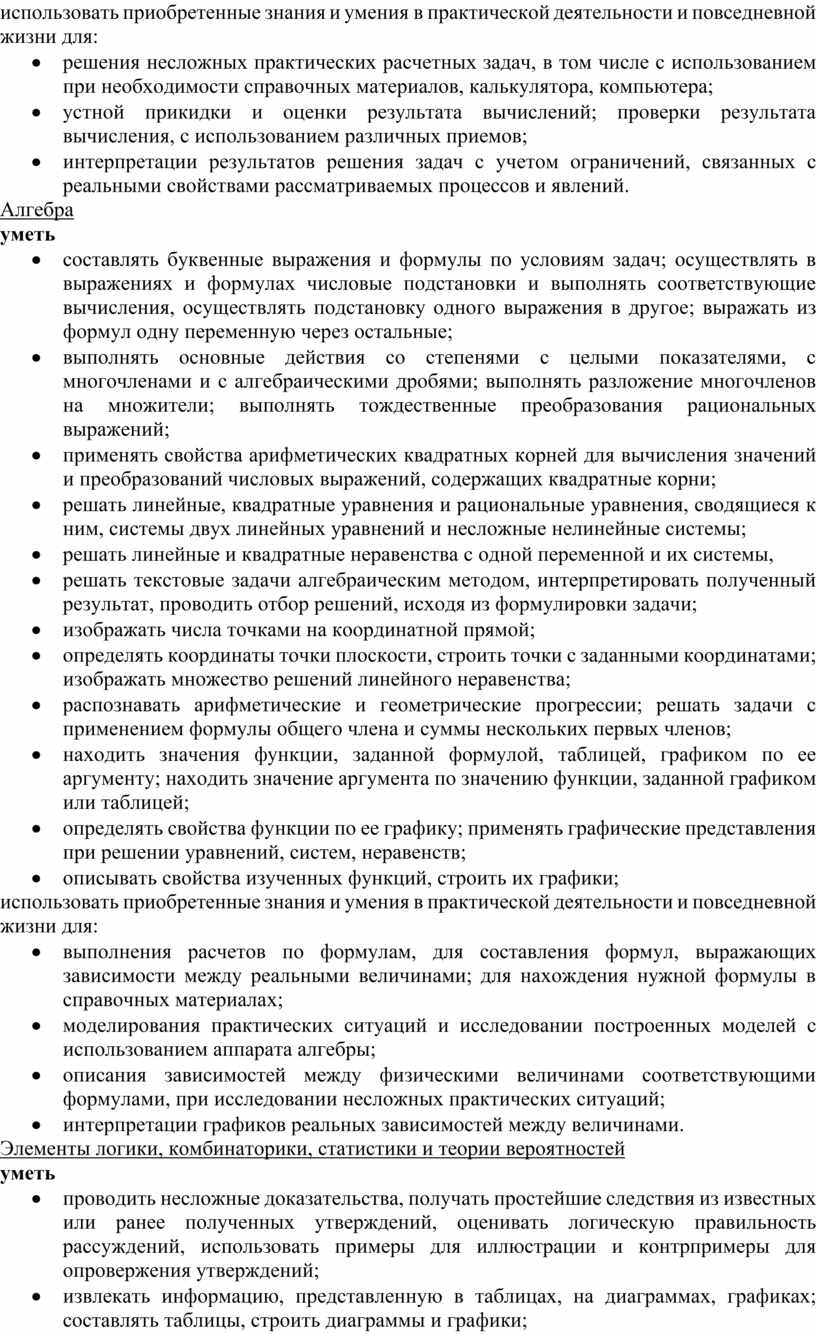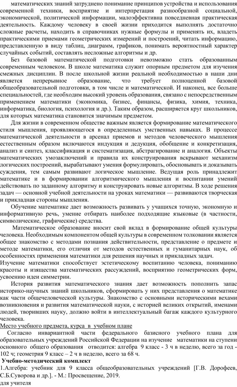 Математическое образование вносит свой вклад в формирование общей культуры человека. Необходимым компонентом общей культуры в современном толковании является общее знакомство с методами познания действительности, представление о предмете и методе математики, его отличия от методов естественных и гуманитарных наук, об особенностях применения математики для решения научных и прикладных задач.