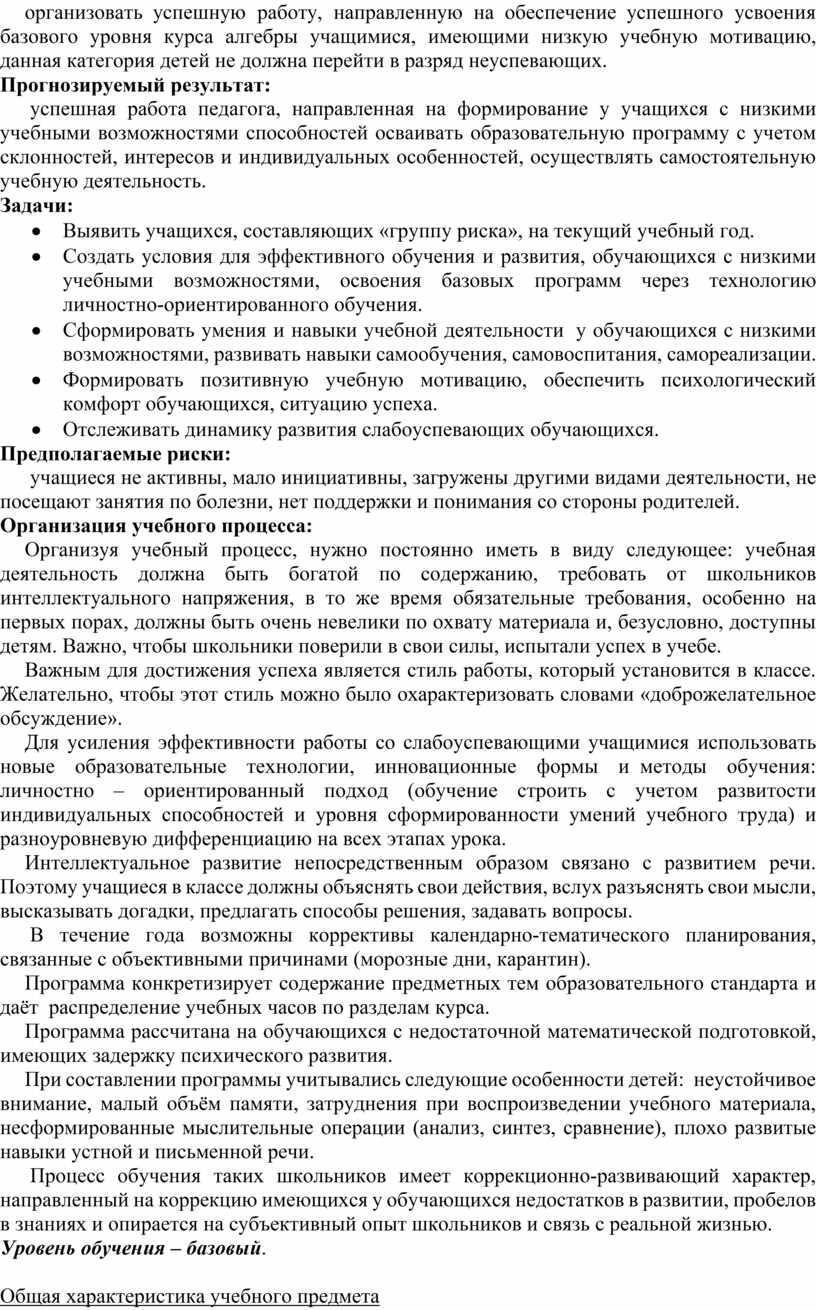 организовать успешную работу, направленную на обеспечение успешного усвоения базового уровня курса алгебры учащимися, имеющими низкую учебную мотивацию, данная категория детей не должна перейти в разряд неуспевающих.