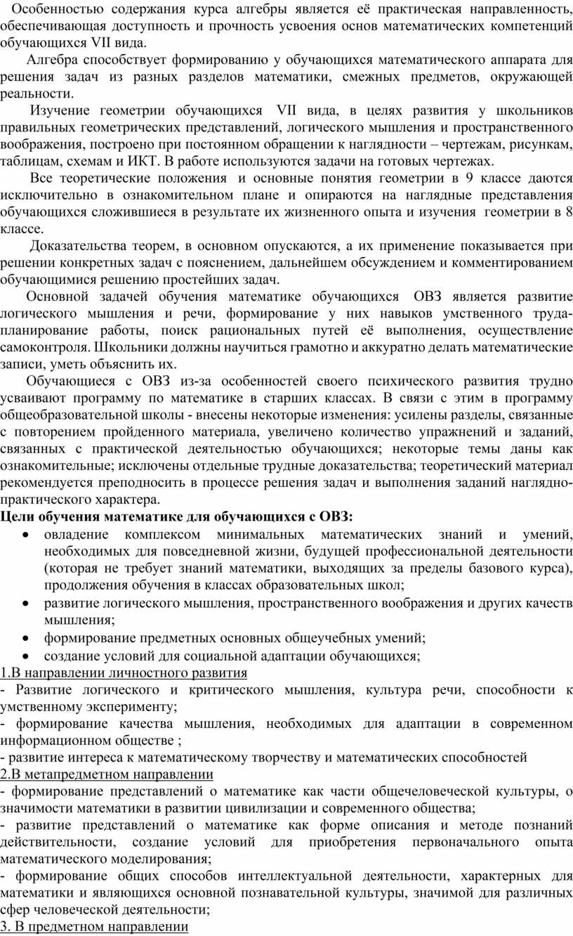 Особенностью содержания курса алгебры является её практическая направленность, обеспечивающая доступность и прочность усвоения основ математических компетенций обучающихся VII вида.