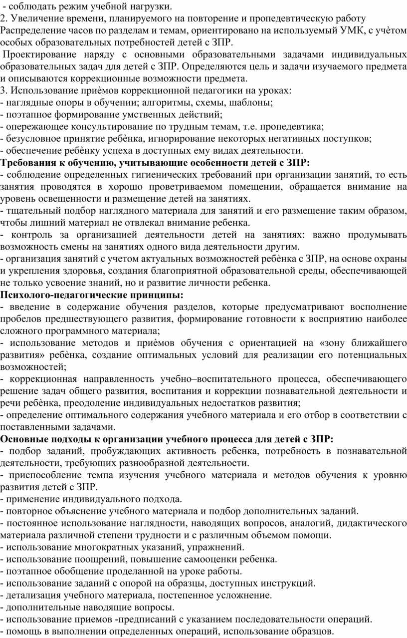 • учете особенностей работоспособности (повышенной истощаемости) школьников с ЗПР при организации всего учебно- воспитательного процесса;