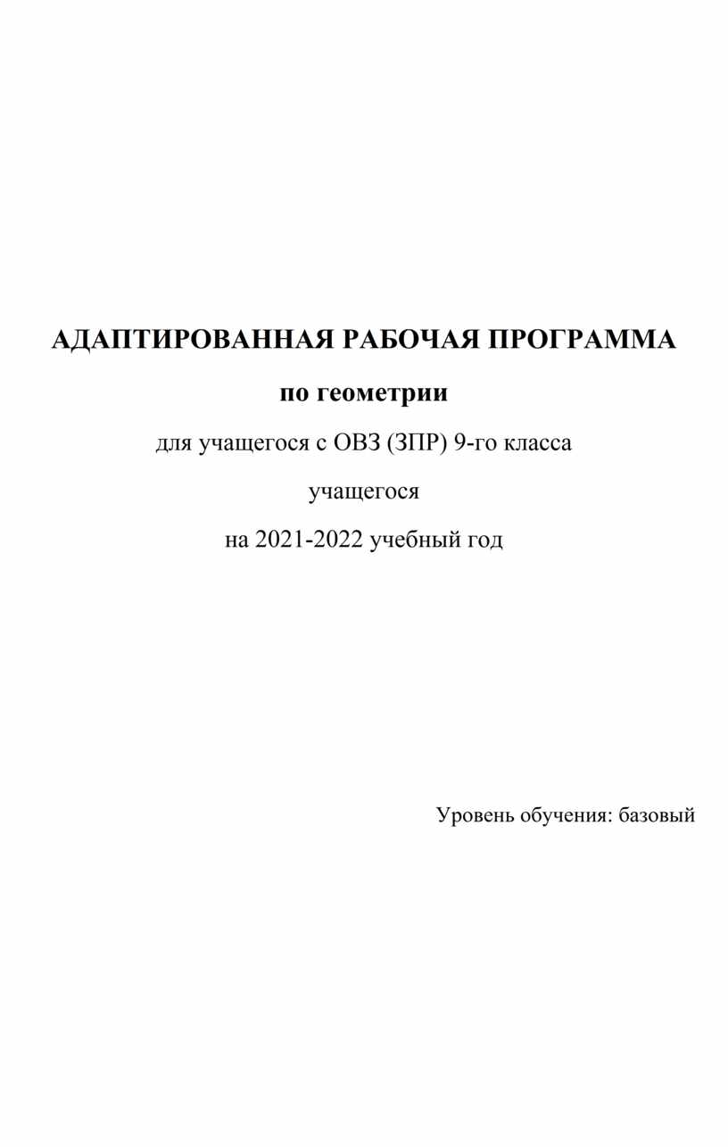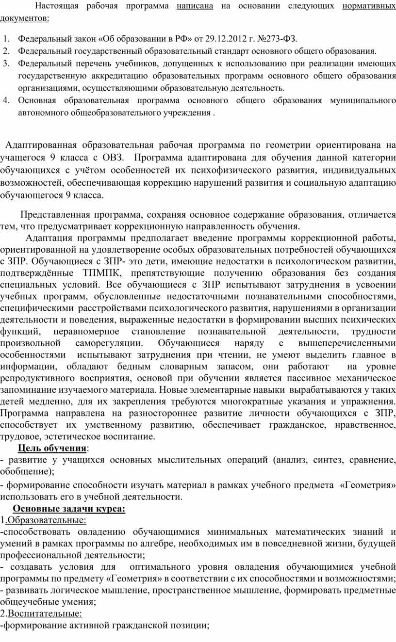 Адаптированная образовательная рабочая программа по геометрии ориентирована на учащегося 9 класса с ОВЗ. Программа адаптирована для обучения данной категории обучающихся с учётом особенностей их психофизического развития, индивидуальных возможностей, обеспечивающая коррекцию нарушений развития и социальную адаптацию обучающегося 9 класса.