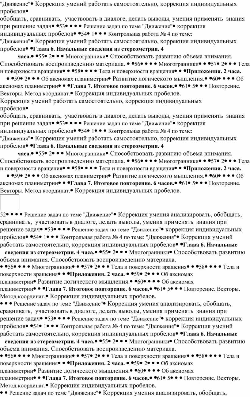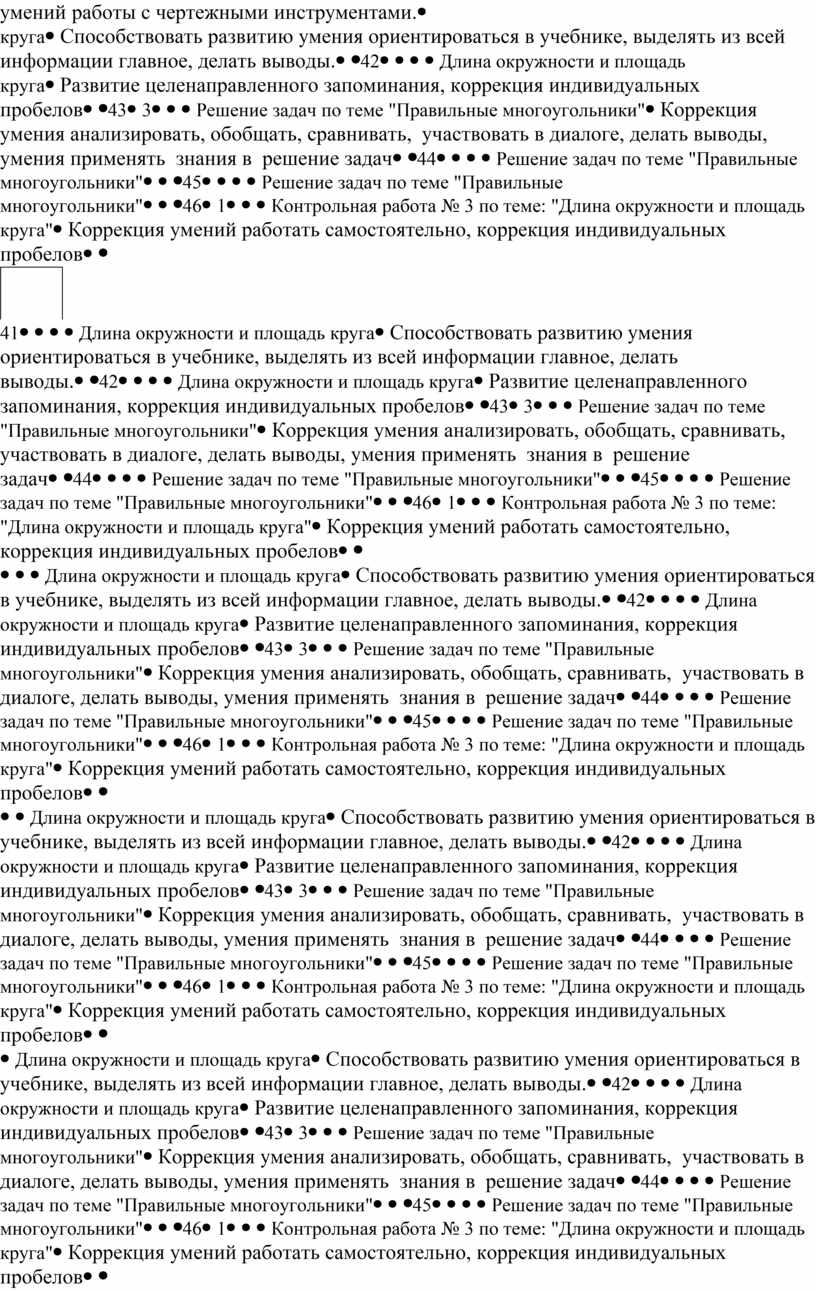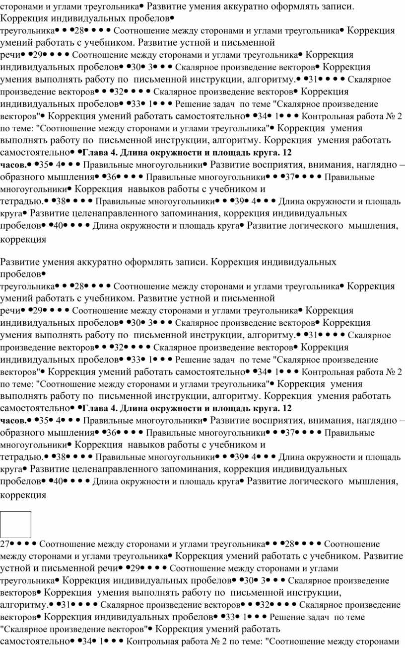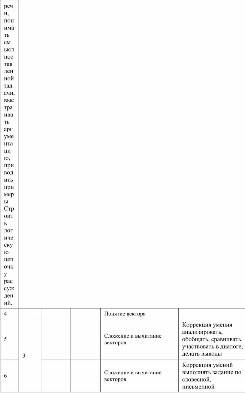 Коррекция индивидуальных пробелов. Коррекция умения выполнять работу по письменной инструкции, по заданному алгоритму, по готовому чертежу, сопоставлять предмет и окружающий мир, рассужать и обобщать, делать выводы. Развитие наглядно-образного мышления, устойчивого внимания, объема памяти. Развитие устной и письменной речи, расширение словарного запаса, умений работать самостоятельно и коллективно. |