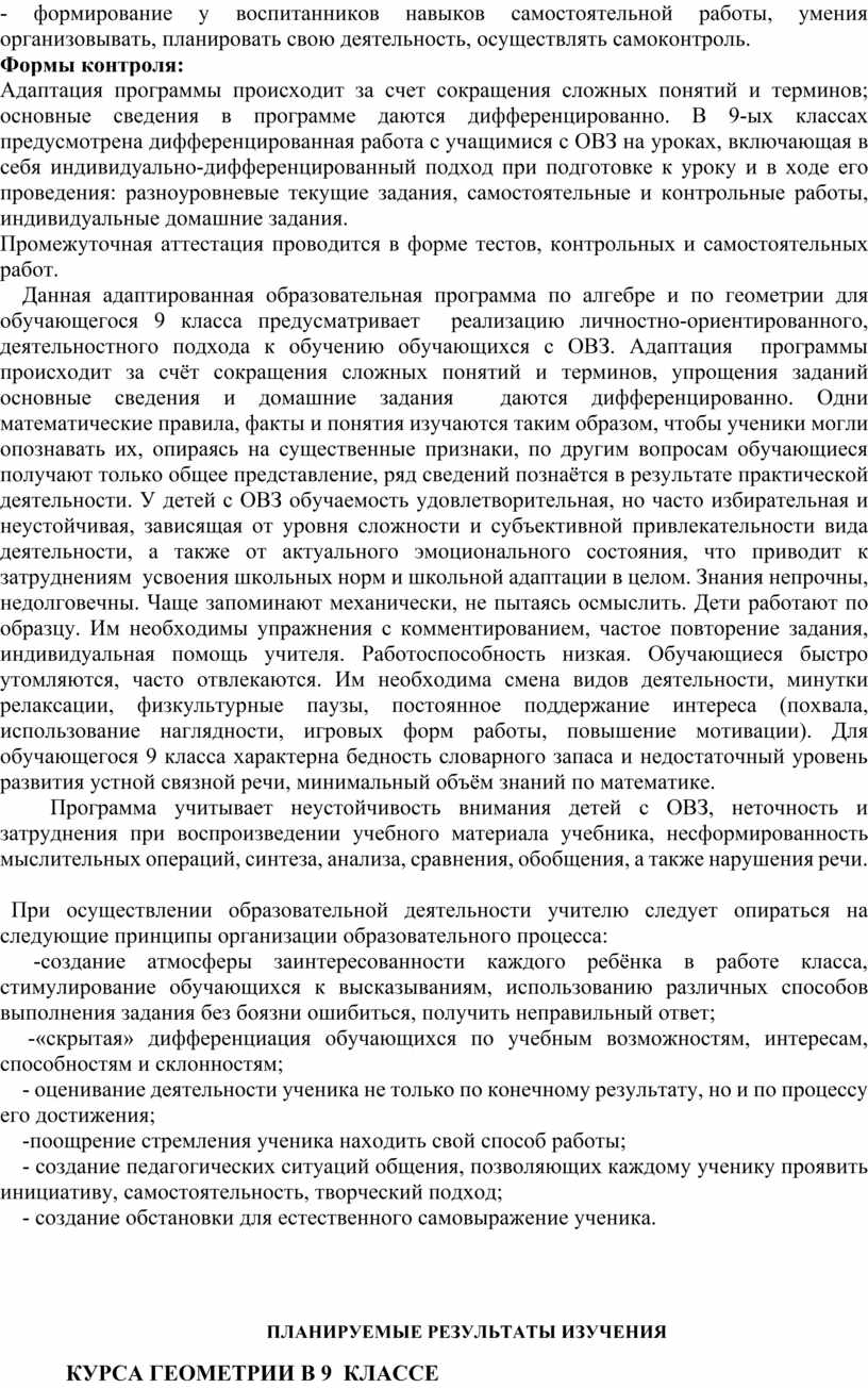 Данная адаптированная образовательная программа по алгебре и по геометрии для обучающегося 9 класса предусматривает реализацию личностно-ориентированного, деятельностного подхода к обучению обучающихся с ОВЗ. Адаптация программы происходит за счёт сокращения сложных понятий и терминов, упрощения заданий основные сведения и домашние задания даются дифференцированно. Одни математические правила, факты и понятия изучаются таким образом, чтобы ученики могли опознавать их, опираясь на существенные признаки, по другим вопросам обучающиеся получают только общее представление, ряд сведений познаётся в результате практической деятельности. У детей с ОВЗ обучаемость удовлетворительная, но часто избирательная и неустойчивая, зависящая от уровня сложности и субъективной привлекательности вида деятельности, а также от актуального эмоционального состояния, что приводит к затруднениям усвоения школьных норм и школьной адаптации в целом. Знания непрочны, недолговечны. Чаще запоминают механически, не пытаясь осмыслить. Дети работают по образцу. Им необходимы упражнения с комментированием, частое повторение задания, индивидуальная помощь учителя. Работоспособность низкая. Обучающиеся быстро утомляются, часто отвлекаются. Им необходима смена видов деятельности, минутки релаксации, физкультурные паузы, постоянное поддержание интереса (похвала, использование наглядности, игровых форм работы, повышение мотивации). Для обучающегося 9 класса характерна бедность словарного запаса и недостаточный уровень развития устной связной речи, минимальный объём знаний по математике.