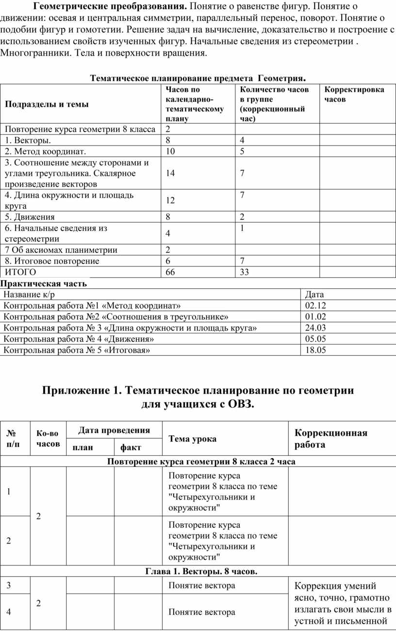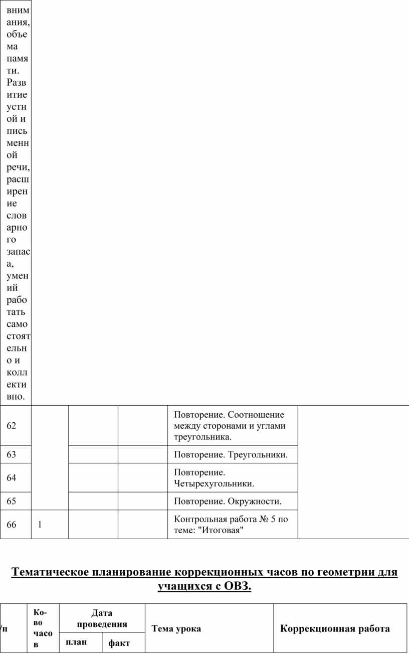 Тематическое планирование коррекционных часов по геометрии для учащихся с ОВЗ.