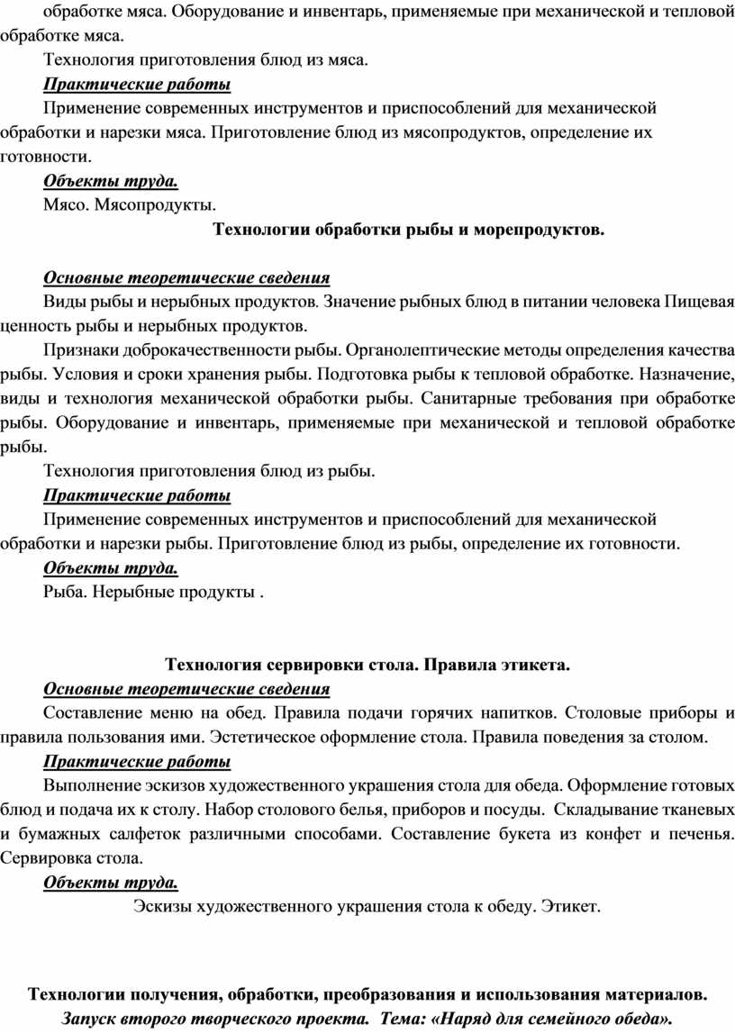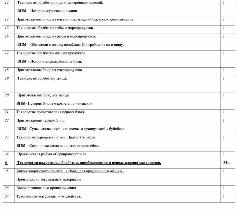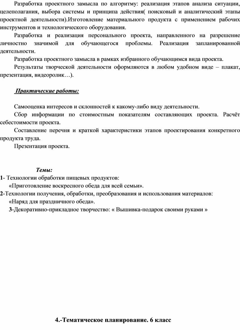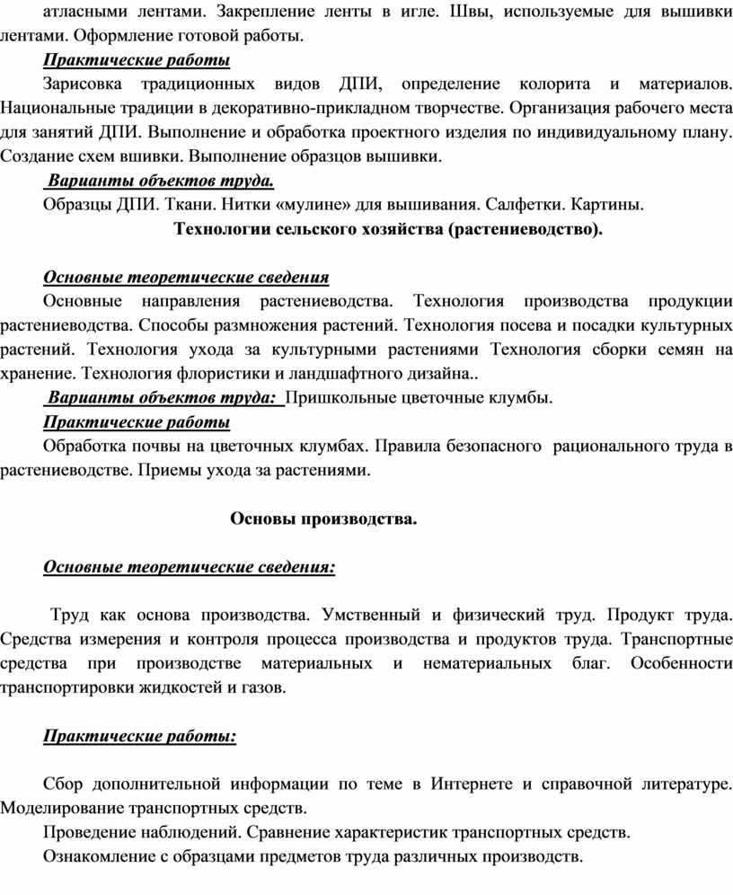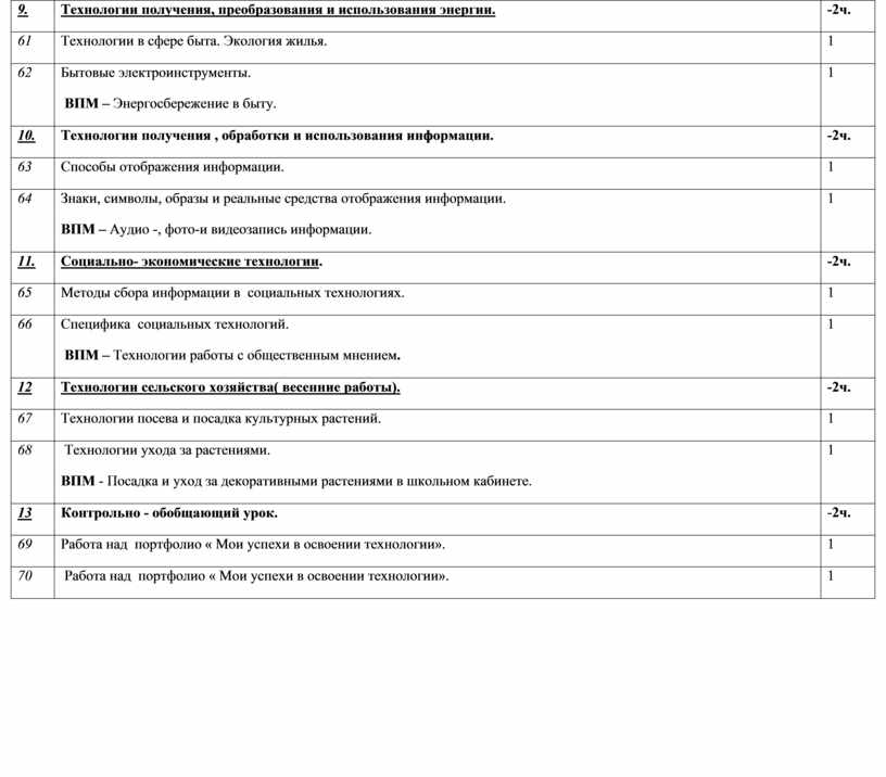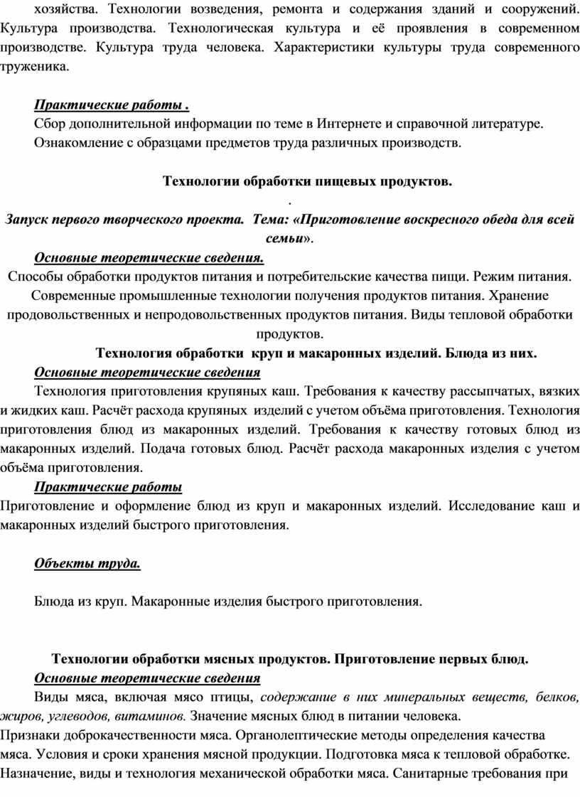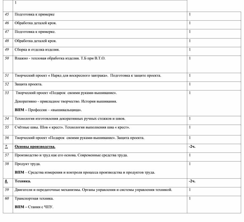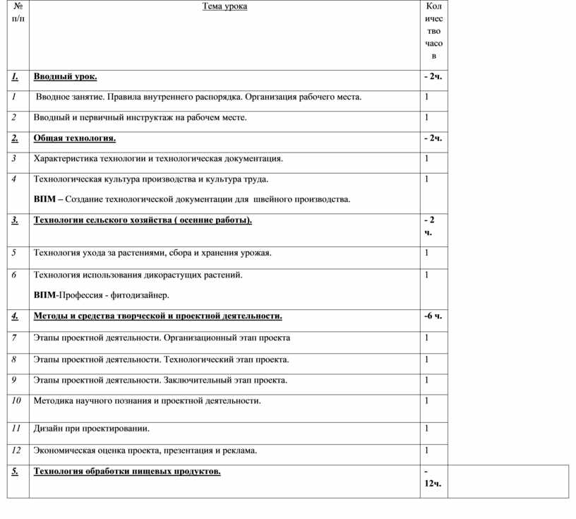 - Вводное занятие - (2 часа) - Общая технология - (2 часа) -Технологии сельского хозяйства (осенние работы) - (2 часа) - Методы и средства творческой и проектной деятельности - (6 часов). - Технология обработки пищевых продуктов - (12 часов) -Технология получения обработки , преобразования и использования материалов -(32 часа). -Основы производства - (2 часа). - Техника - (2 часа). -Технология получения ,преобразования и использования энергии - (2 часа). -Технология получения, обработки и использования информации - ( 2 часа). -Социально - экономические технологии.-( 2 часа). -Технологии сельского хозяйства( весенние работы) (2 часа). -Контрольно-обобщающий урок- (2 часа). ВПМ «Технологии творческой и опытнической деятельности» - ( 21 час).