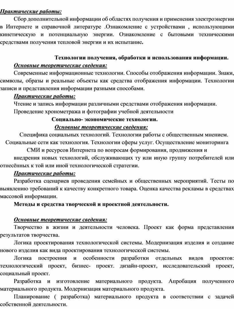 Базовыми для программы являются разделы : «Технологии обработки пищевых продуктов», «Создание изделий из текстильных материалов», «Художественные ремёсла», « Технологии сельского хозяйства», « Общая технология», « Основы производства», « Техника», « Технологии получения, обработки, преобразования и использования материалов», «Технологии получения, преобразования и использования энергии», « Технологии получения, обработки и использования информации», « Социально – экономические технологии», « Методы и средства творческой и проектной деятельности».