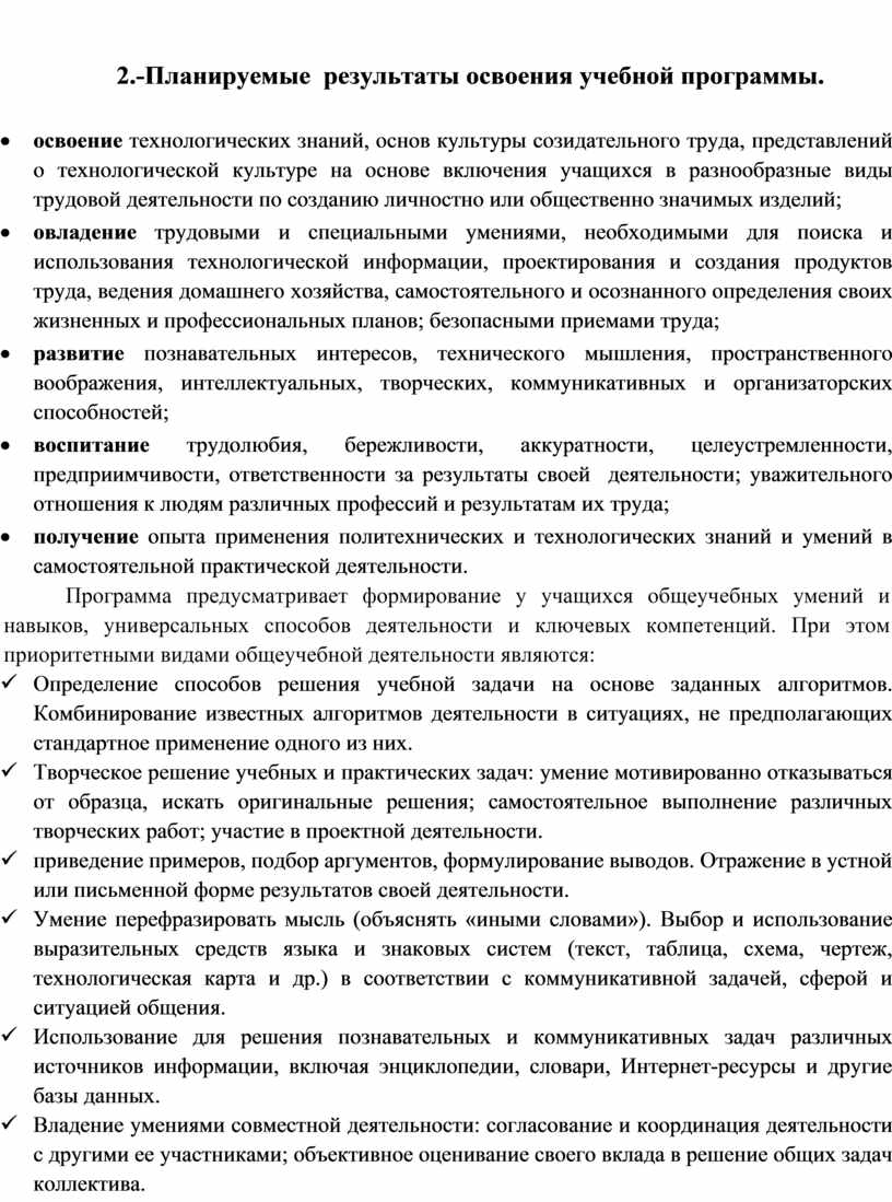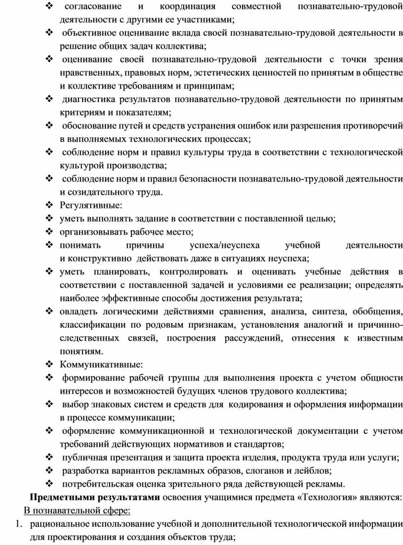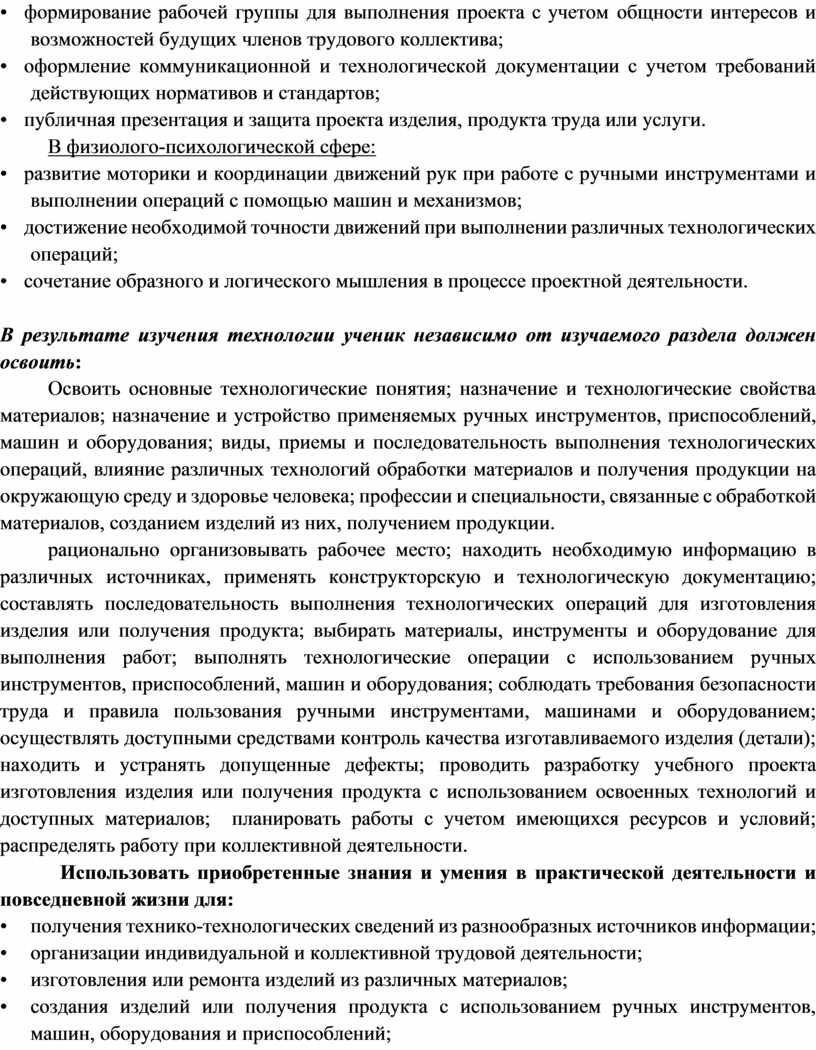 · освоение технологических знаний, основ культуры созидательного труда, представлений о технологической культуре на основе включения учащихся в разнообразные виды трудовой деятельности по созданию личностно или общественно значимых изделий;