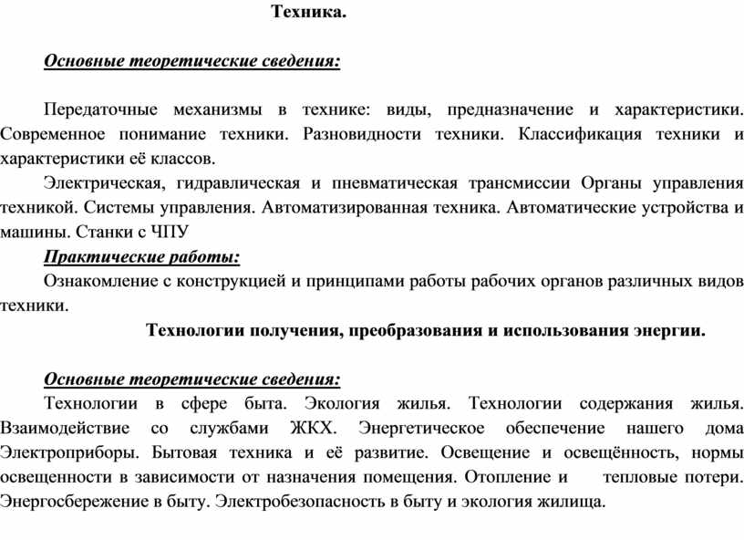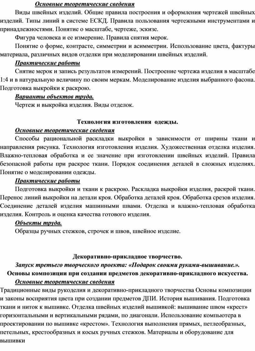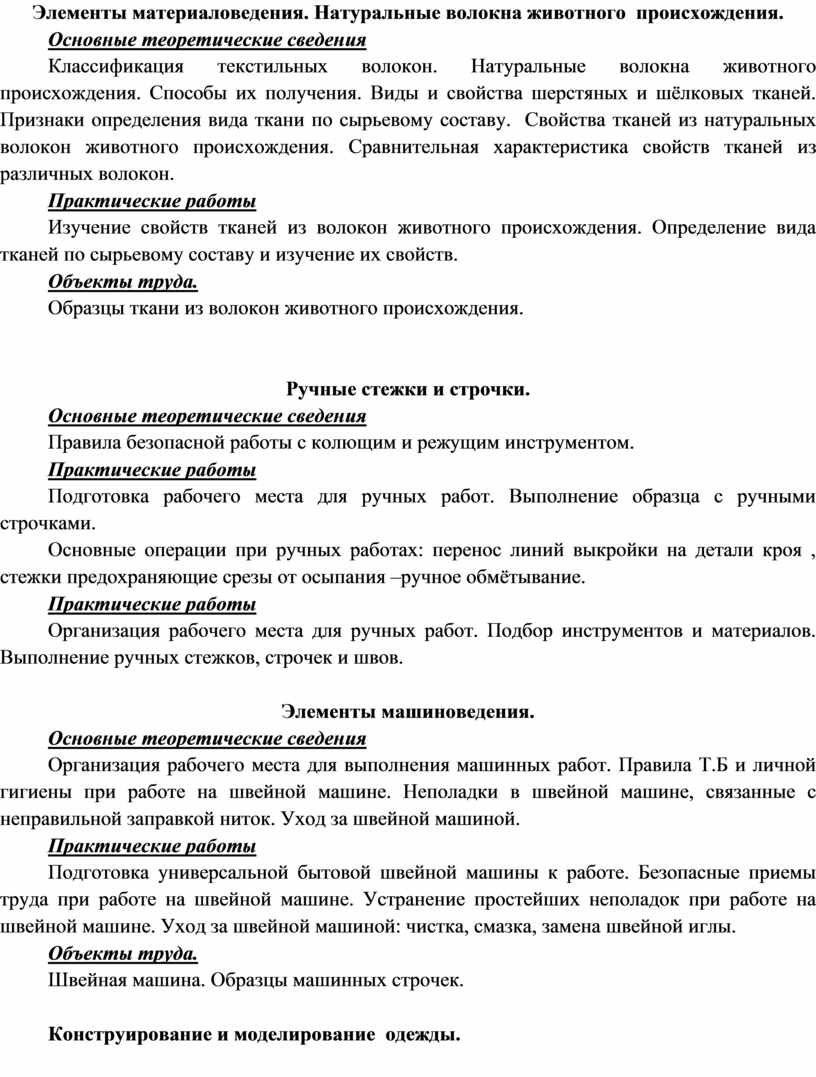 Каждый раздел программы включает в себя основные теоретические сведения, практические работы и рекомендуемые объекты труда.