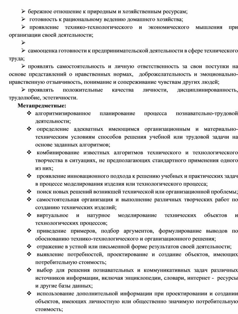 · овладение трудовыми и специальными умениями, необходимыми для поиска и использования технологической информации, проектирования и создания продуктов труда, ведения домашнего хозяйства, самостоятельного и осознанного определения своих жизненных и профессиональных планов; безопасными приемами труда;