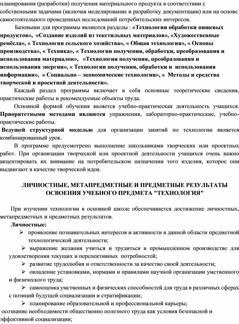При изучении технологии в основной школе обеспечивается достижение личностных, метапредметных и предметных результатов.