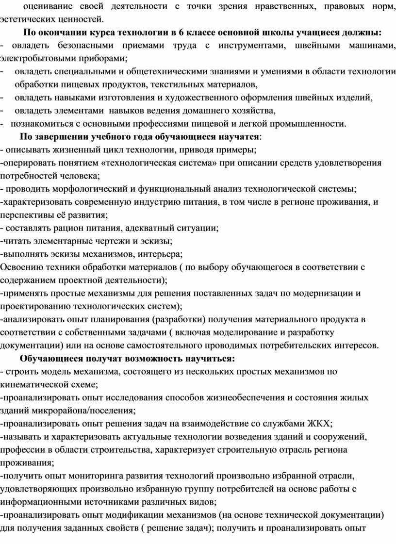По окончании курса технологии в 6 классе основной школы учащиеся должны: