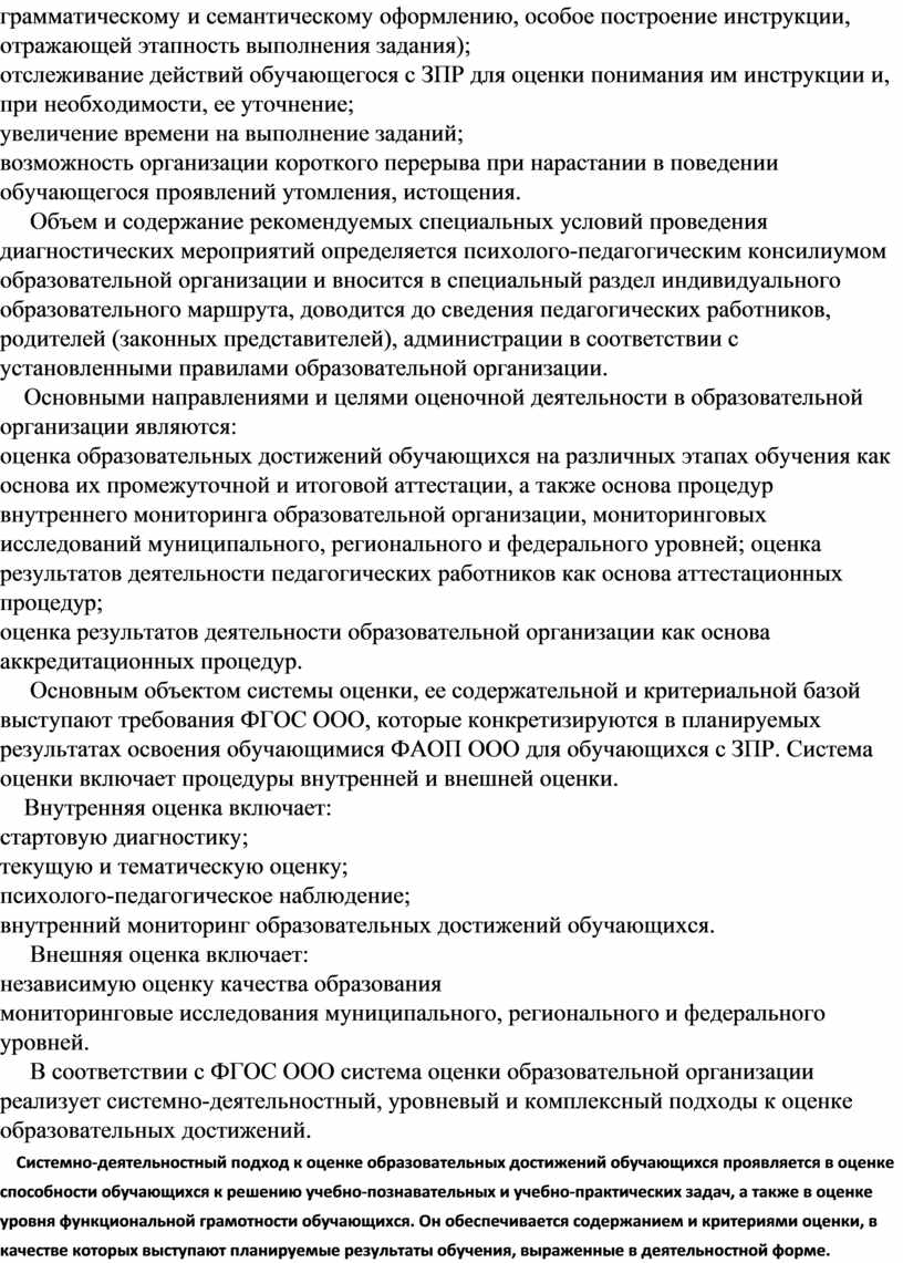 При организации оценочных процедур для обучающихся в соответствии с ФАОП ООО для обучающихся с ЗПР создаются специальные условия, обусловленные особыми образовательными потребностями обучающихся с ЗПР и спецификой нарушения. Данные условия могут включать:
