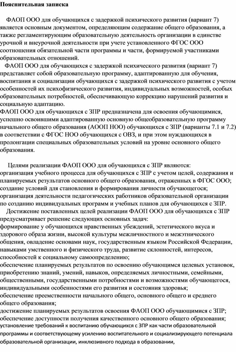 ФАОП ООО для обучающихся с задержкой психического развития (вариант 7) является основным документом, определяющим содержание общего образования, а также регламентирующим образовательную деятельность организации в единстве урочной и внеурочной деятельности при учете установленного ФГОС ООО соотношения обязательной части программы и части, формируемой участниками образовательных отношений.