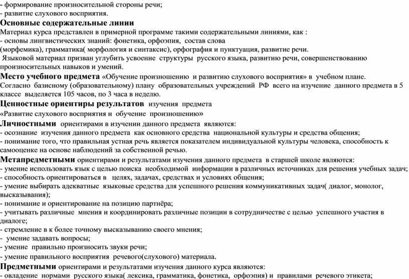 Специфика данной учебной дисциплины состоит в том, что развитие слухового восприятия и формирование произношения устной речи происходит на слуховой и слухо-зрительной основе. Навыки восприятия речи на слух улучшают в процессе формирования произношения в условиях различных видов речевой деятельности. Особый акцент в программе сделан на дальнейшее совершенствование произносительных навыков. |