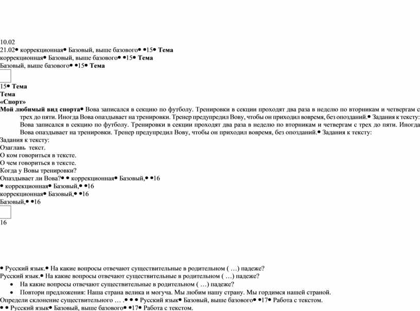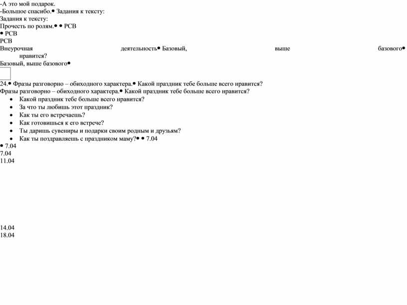 Задания к тексту: Когда ребята просыпаются? Что они делают утром? Что школьники делают в середине дня? Как ребята проводят вечер? Продолжи: «Вечером мы занимаемся в кружках, …» Что важно научиться соблюдать со школьных лет? Словарь: режим дня, нужно - необходимо, выполнять - соблюдать, вставать, ложиться.