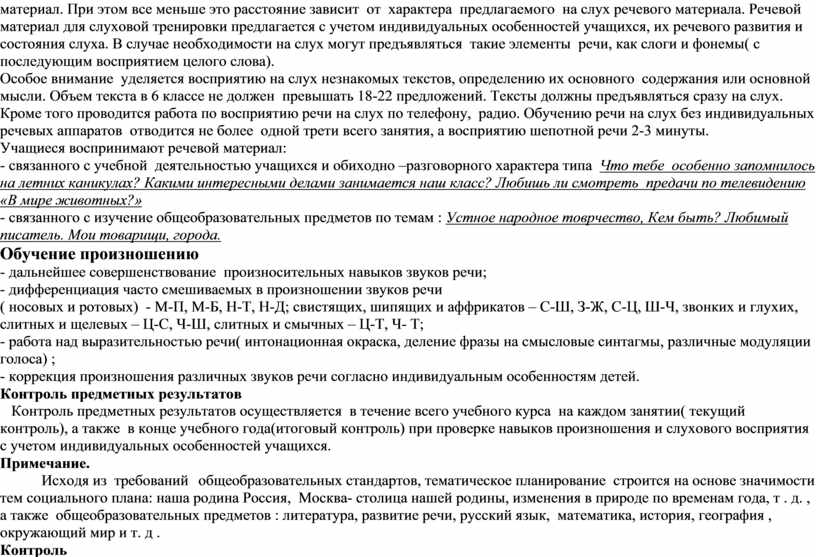 Особое внимание уделяется восприятию на слух незнакомых текстов, определению их основного содержания или основной мысли. Объем текста в 6 классе не должен превышать 18-22 предложений. Тексты должны предъявляться сразу на слух. Кроме того проводится работа по восприятию речи на слух по телефону, радио. Обучению речи на слух без индивидуальных речевых аппаратов отводится не более одной трети всего занятия, а восприятию шепотной речи 2-3 минуты.