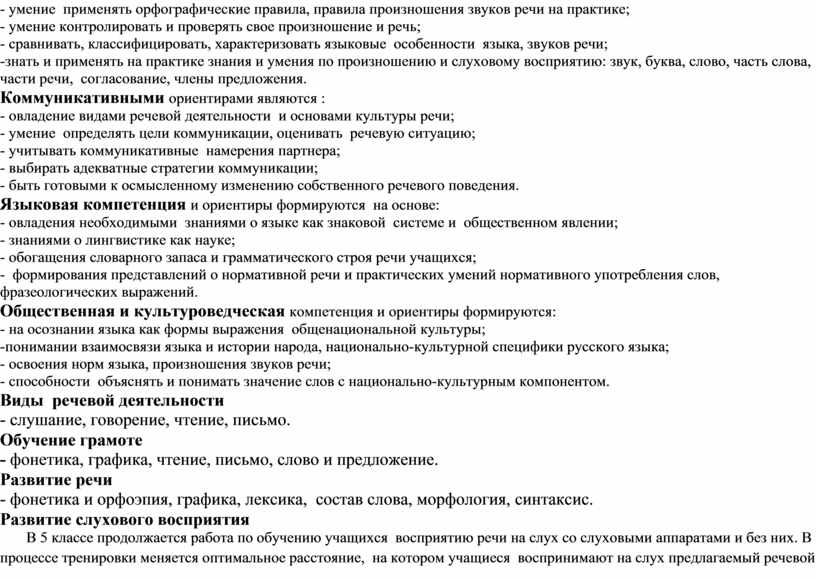 -знать и применять на практике знания и умения по произношению и слуховому восприятию: звук, буква, слово, часть слова, части речи, согласование, члены предложения.
