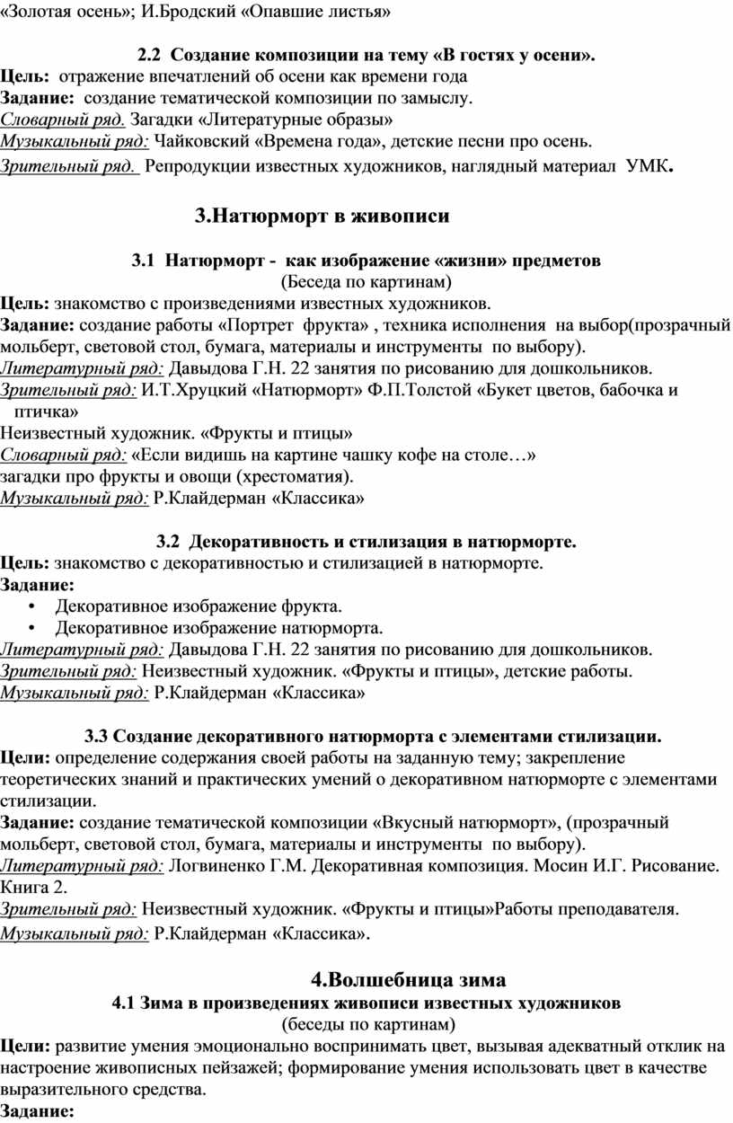 Цель: развитие умения эмоционально воспринимать цвет, вызывая адекватный отклик на настроение живописных пейзажей и натюрмортов.