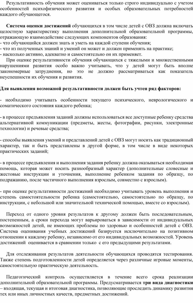Система оценки достижений обучающихся в том числе детей с ОВЗ должна включать целостную характеристику выполнения дополнительной образовательной программы, отражающую взаимодействие следующих компонентов образования: