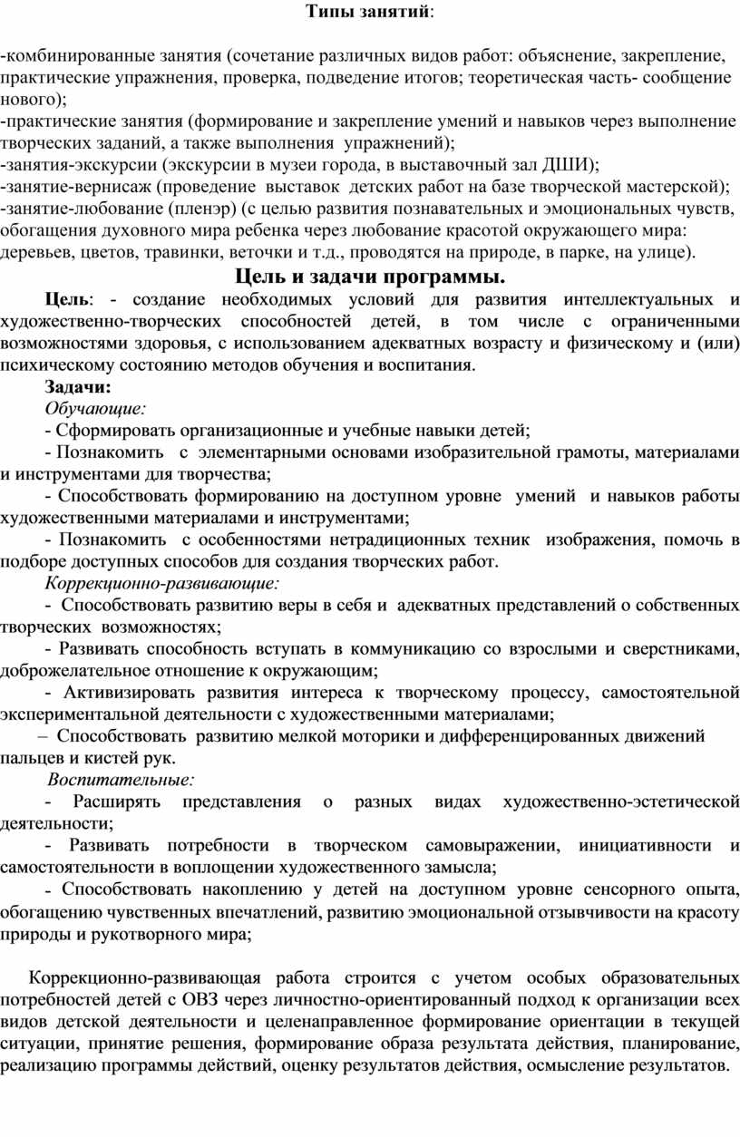 Цель: - создание необходимых условий для развития интеллектуальных и художественно-творческих способностей детей, в том числе с ограниченными возможностями здоровья, с использованием адекватных возрасту и физическому и (или) психическому состоянию методов обучения и воспитания.