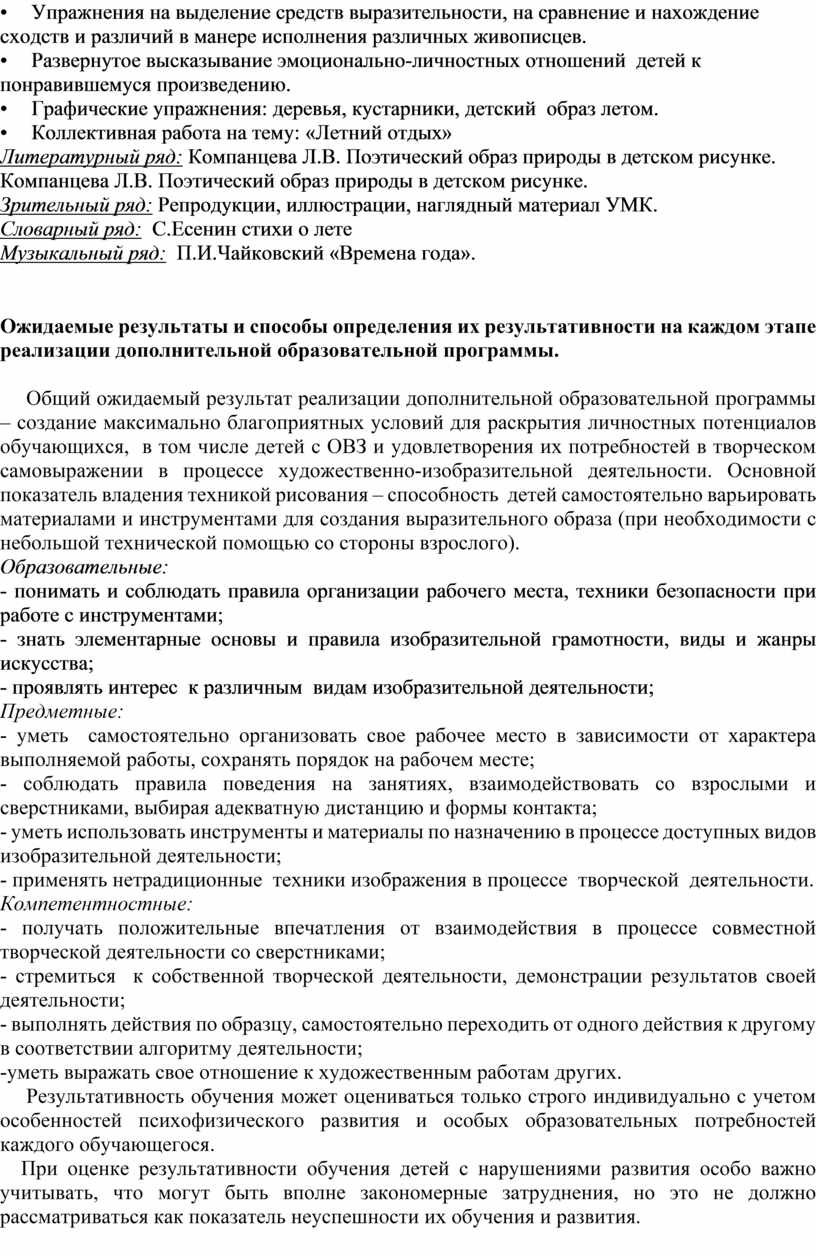 Общий ожидаемый результат реализации дополнительной образовательной программы – создание максимально благоприятных условий для раскрытия личностных потенциалов обучающихся, в том числе детей с ОВЗ и удовлетворения их потребностей в творческом самовыражении в процессе художественно-изобразительной деятельности. Основной показатель владения техникой рисования – способность детей самостоятельно варьировать материалами и инструментами для создания выразительного образа (при необходимости с небольшой технической помощью со стороны взрослого).