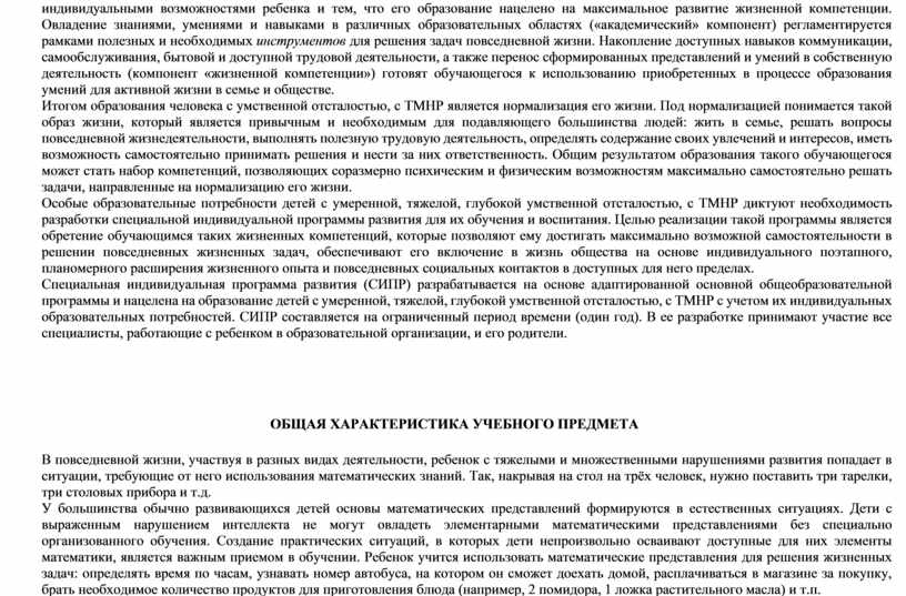 Особые образовательные потребности детей с умеренной, тяжелой, глубокой умственной отсталостью, с ТМНР диктуют необходимость разработки специальной индивидуальной программы развития для их обучения и воспитания. Целью реализации такой программы является обретение обучающимся таких жизненных компетенций, которые позволяют ему достигать максимально возможной самостоятельности в решении повседневных жизненных задач, обеспечивают его включение в жизнь общества на основе индивидуального поэтапного, планомерного расширения жизненного опыта и повседневных социальных контактов в доступных для него пределах.