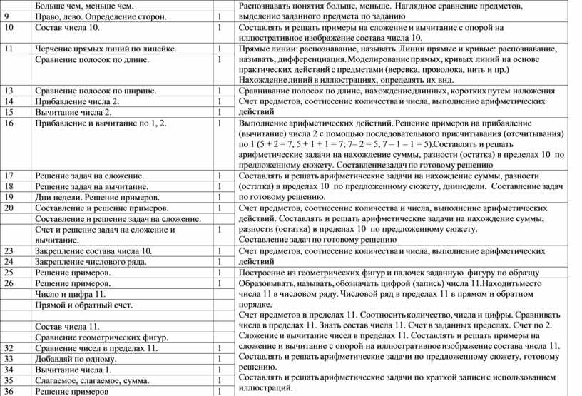 Образовывать, называть, обозначать цифрой (запись) числа 11.Находить место числа 11 в числовом ряду. Числовой ряд в пределах 11 в прямом и обратном порядке. Счет предметов в пределах 11. Соотносить количество, числа и цифры. Сравнивать числа в пределах 11. Знать состав числа 11. Счет в заданных пределах. Счет по 2. Сложение и вычитание чисел в пределах 11. Составлять и решать примеры на сложение и вычитание с опорой на иллюстративное изображение состава числа 11. Составлять и решать арифметические задачи по предложенному сюжету, готовому решению. Составлять и решать арифметические задачи по краткой записи с использованием иллюстраций. |