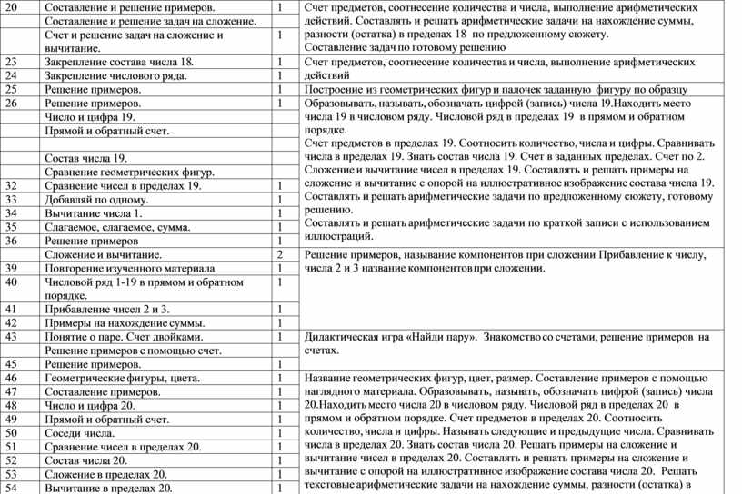 Образовывать, называть, обозначать цифрой (запись) числа 19.Находить место числа 19 в числовом ряду. Числовой ряд в пределах 19 в прямом и обратном порядке. Счет предметов в пределах 19. Соотносить количество, числа и цифры. Сравнивать числа в пределах 19. Знать состав числа 19. Счет в заданных пределах. Счет по 2. Сложение и вычитание чисел в пределах 19. Составлять и решать примеры на сложение и вычитание с опорой на иллюстративное изображение состава числа 19. Составлять и решать арифметические задачи по предложенному сюжету, готовому решению. Составлять и решать арифметические задачи по краткой записи с использованием иллюстраций. |