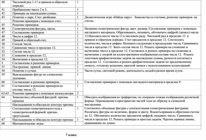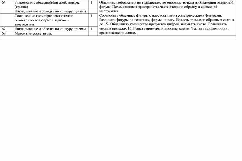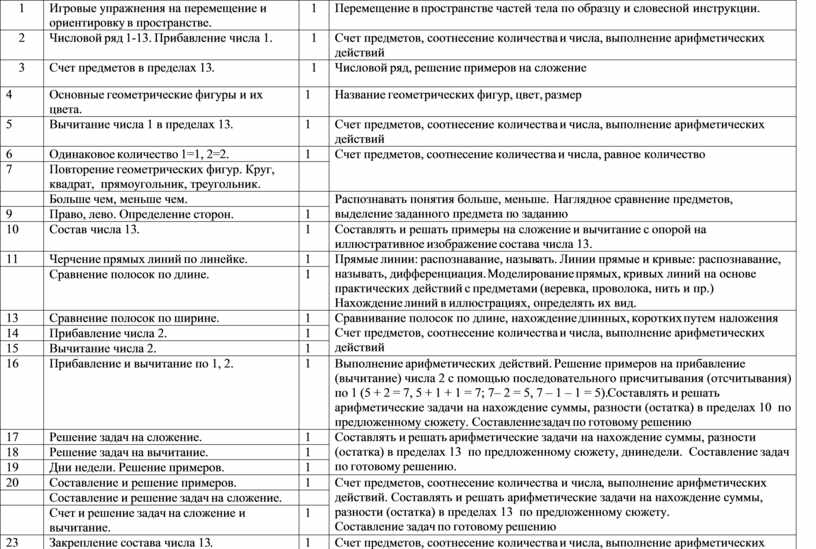 Обводить изображения по трафаретам, по опорным точкам изображения различной формы. Перемещение в пространстве частей тела по образцу и словесной инструкции. Соотносить объемные фигуры с плоскостными геометрическими фигурами. Различать фигуры по величине, форме и цвету. Владеть прямым и обратным счетом до 12. Обозначать количество предметов цифрой, называть число. Сравнивать числа в пределах 12. Решать примеры и простые задачи. Чертить прямые линии, сравнивание по длине. |