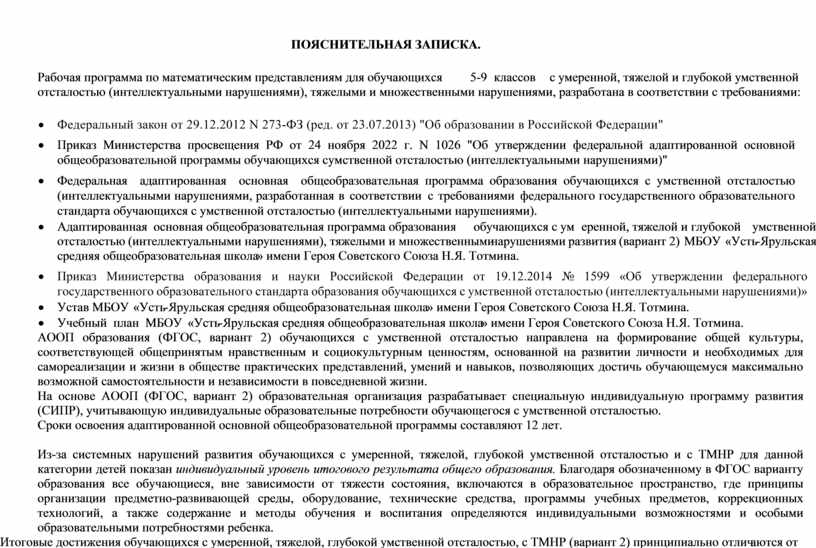 Рабочая программа по математическим представлениям для обучающихся 5-9 классов с умеренной, тяжелой и глубокой умственной отсталостью (интеллектуальными нарушениями), тяжелыми и множественными нарушениями, разработана в соответствии с требованиями:
