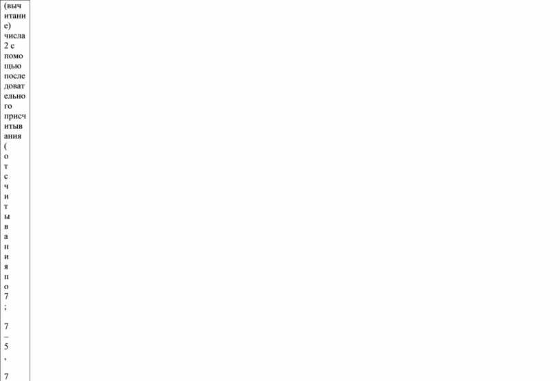 Выполнение арифметических действий. Решение примеров на прибавление (вычитание) числа 2 с помощью последовательного присчитывания (отсчитывания) по 1 (5 + 2 = 7, 5 + 1 + 1 = 7; 7– 2 = 5, 7 – 1 – 1 = 5). Составлять и решать арифметические задачи на нахождение суммы, разности (остатка) в пределах 10 по предложенному сюжету. Составление задач по готовому решению |