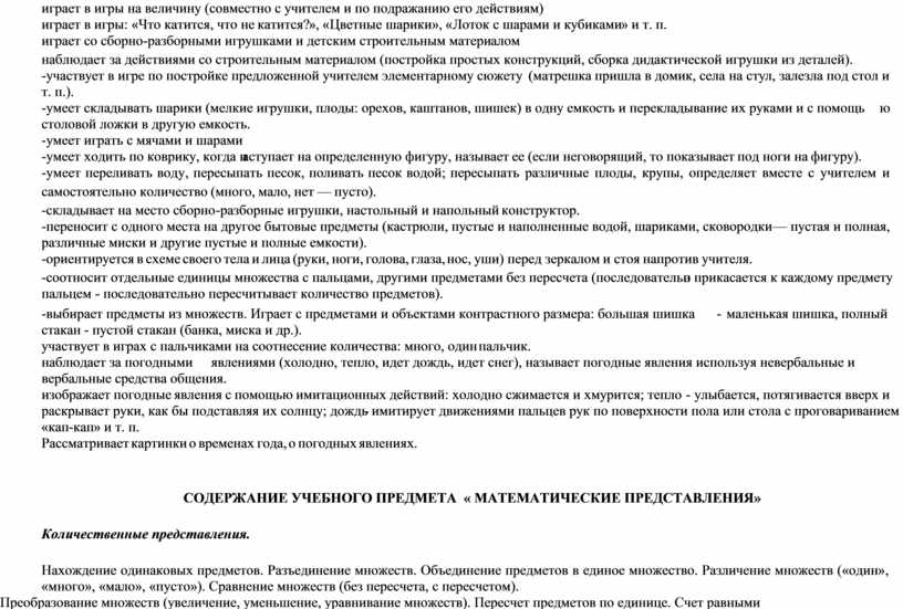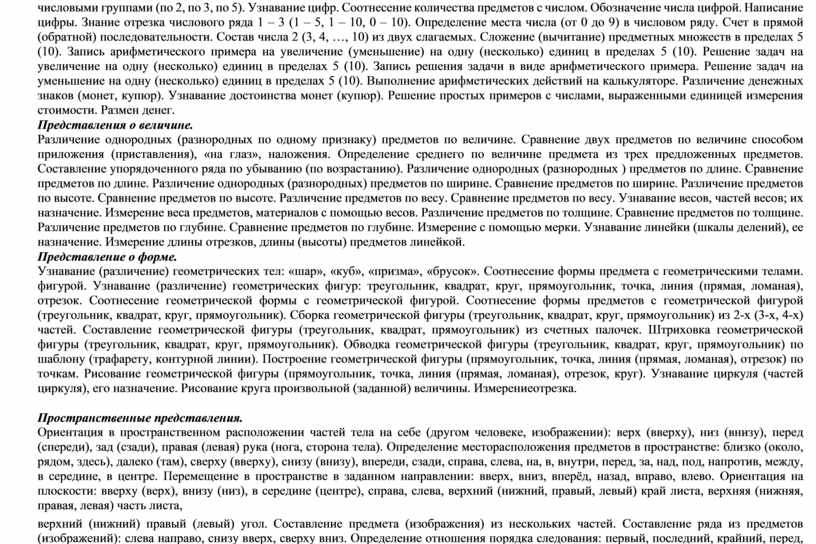 Примерная программа построена на основе следующих разделов: «Количественные представления», «Представления о форме», «Представления о величине», «Пространственные представления», «Временные представления».