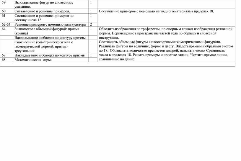 Обводить изображения по трафаретам, по опорным точкам изображения различной формы. Перемещение в пространстве частей тела по образцу и словесной инструкции. Соотносить объемные фигуры с плоскостными геометрическими фигурами. Различать фигуры по величине, форме и цвету. Владеть прямым и обратным счетом до 18. Обозначать количество предметов цифрой, называть число. Сравнивать числа в пределах 18. Решать примеры и простые задачи. Чертить прямые линии, сравнивание по длине. |