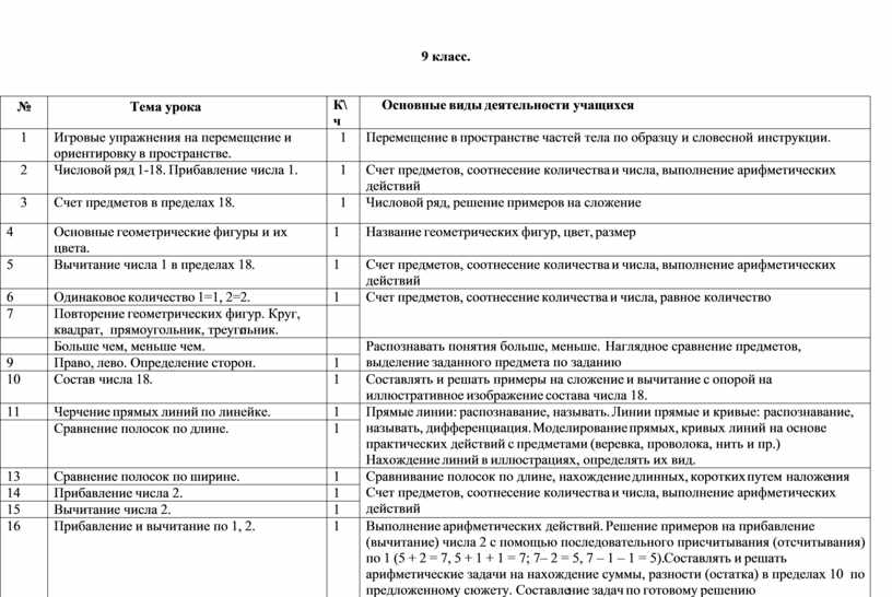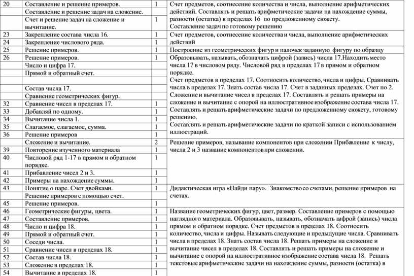 Образовывать, называть, обозначать цифрой (запись) числа 17.Находить место числа 17 в числовом ряду. Числовой ряд в пределах 17 в прямом и обратном порядке. Счет предметов в пределах 17. Соотносить количество, числа и цифры. Сравнивать числа в пределах 17. Знать состав числа 17. Счет в заданных пределах. Счет по 2. Сложение и вычитание чисел в пределах 17. Составлять и решать примеры на сложение и вычитание с опорой на иллюстративное изображение состава числа 17. Составлять и решать арифметические задачи по предложенному сюжету, готовому решению. Составлять и решать арифметические задачи по краткой записи с использованием иллюстраций. |