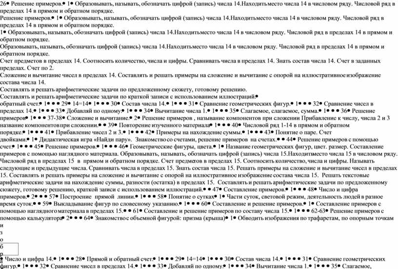 Образовывать, называть, обозначать цифрой (запись) числа 14.Находить место числа 14 в числовом ряду. Числовой ряд в пределах 14 в прямом и обратном порядке. Счет предметов в пределах 14. Соотносить количество, числа и цифры. Сравнивать числа в пределах 14. Знать состав числа 14. Счет в заданных пределах. Счет по 2. Сложение и вычитание чисел в пределах 14. Составлять и решать примеры на сложение и вычитание с опорой на иллюстративное изображение состава числа 14. Составлять и решать арифметические задачи по предложенному сюжету, готовому решению. Составлять и решать арифметические задачи по краткой записи с использованием иллюстраций. |