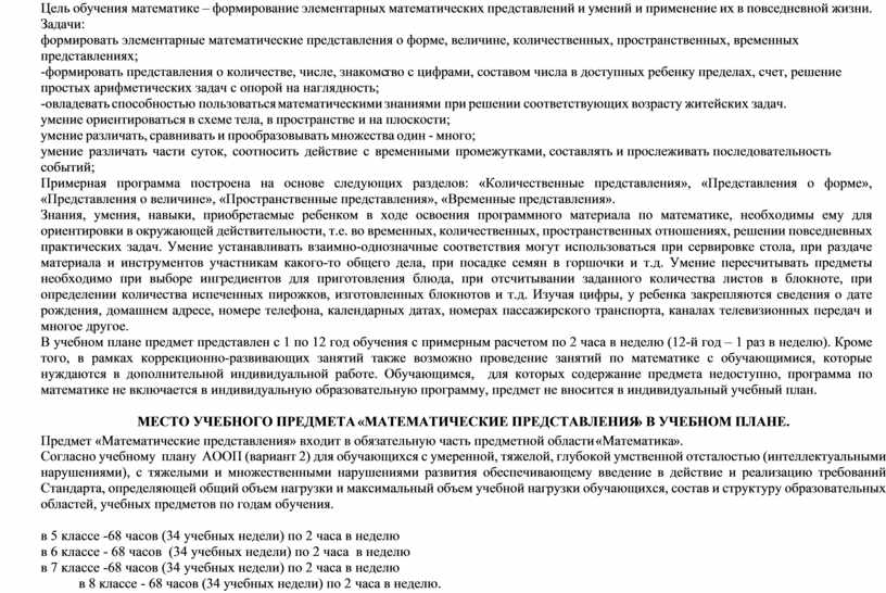 В учебном плане предмет представлен с 1 по 12 год обучения с примерным расчетом по 2 часа в неделю (12-й год – 1 раз в неделю). Кроме того, в рамках коррекционно-развивающих занятий также возможно проведение занятий по математике с обучающимися, которые нуждаются в дополнительной индивидуальной работе. Обучающимся, для которых содержание предмета недоступно, программа по математике не включается в индивидуальную образовательную программу, предмет не вносится в индивидуальный учебный план.