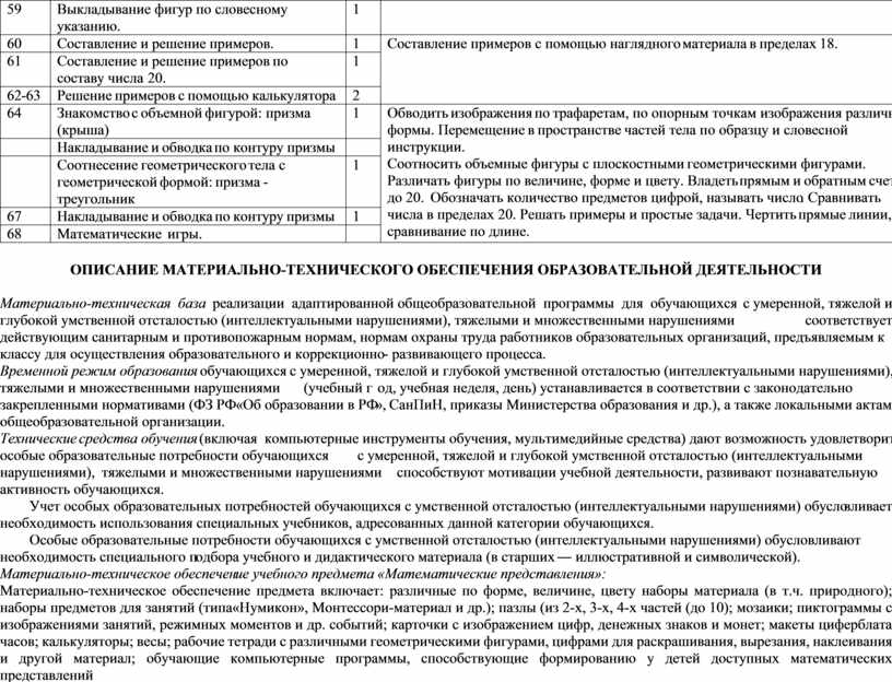 Материально-техническое обеспечение предмета включает: различные по форме, величине, цвету наборы материала (в т.ч. природного); наборы предметов для занятий (типа«Нумикон», Монтессори-материал и др.); пазлы (из 2-х, 3-х, 4-х частей (до 10); мозаики; пиктограммы с изображениями занятий, режимных моментов и др. событий; карточки с изображением цифр, денежных знаков и монет; макеты циферблата часов; калькуляторы; весы; рабочие тетради с различными геометрическими фигурами, цифрами для раскрашивания, вырезания, наклеивания и другой материал; обучающие компьютерные программы, способствующие формированию у детей доступных математических представлений