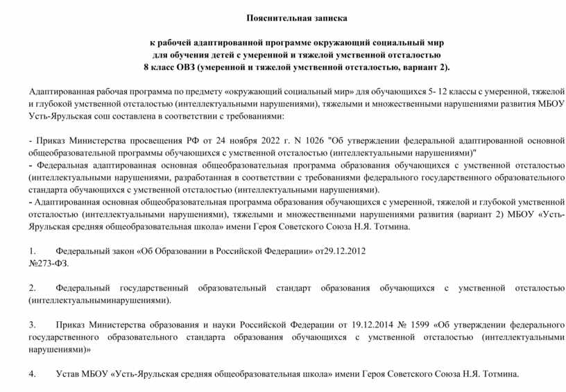 Адаптированная рабочая программа по предмету «окружающий социальный мир» для обучающихся 5- 12 классы с умеренной, тяжелой и глубокой умственной отсталостью (интеллектуальными нарушениями), тяжелыми и множественными нарушениями развития МБОУ Усть-Ярульская сош составлена в соответствии с требованиями:
