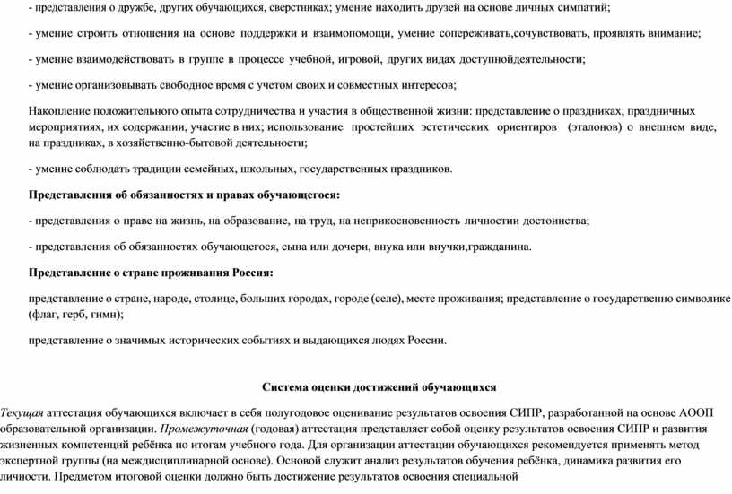 Система оценки результатов отражает степень выполнения учащимся СИПР, взаимодействие следующих компонентов:
