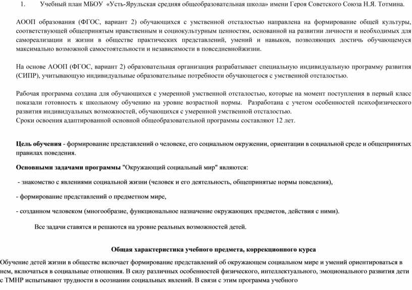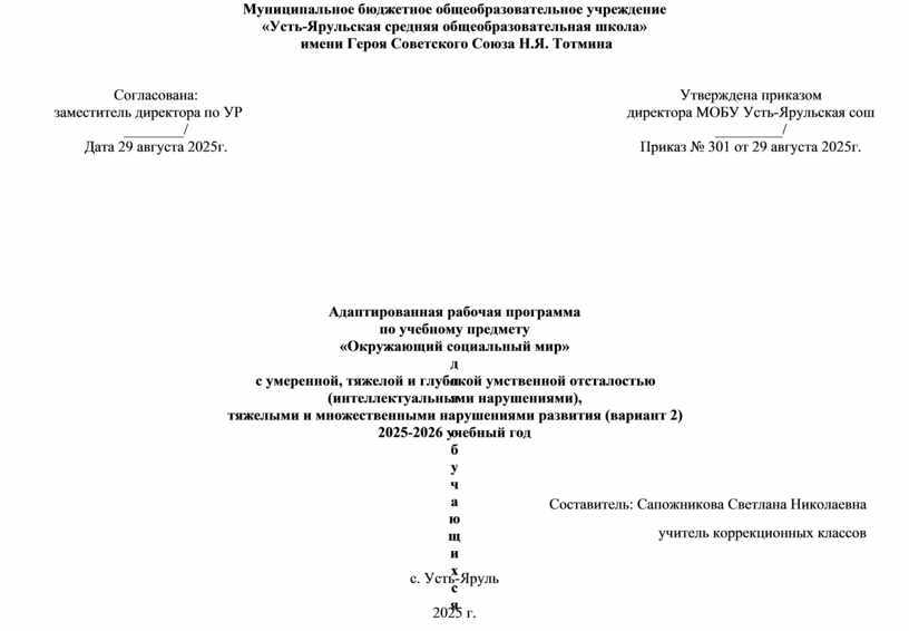 - Адаптированная основная общеобразовательная программа образования обучающихся с умеренной, тяжелой и глубокой умственной отсталостью (интеллектуальными нарушениями), тяжелыми и множественными нарушениями развития (вариант 2) МБОУ «Усть-Ярульская средняя общеобразовательная школа» имени Героя Советского Союза Н.Я. Тотмина.